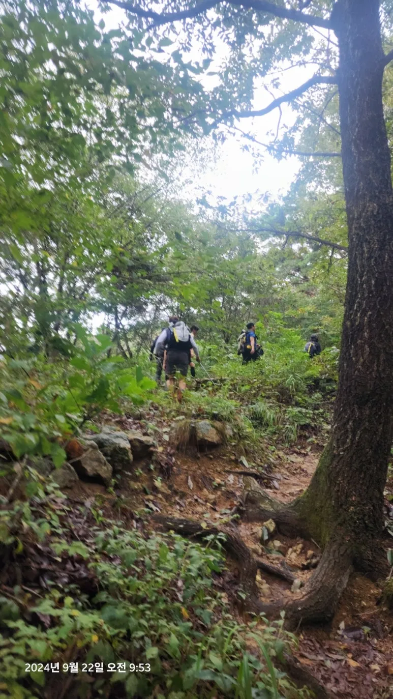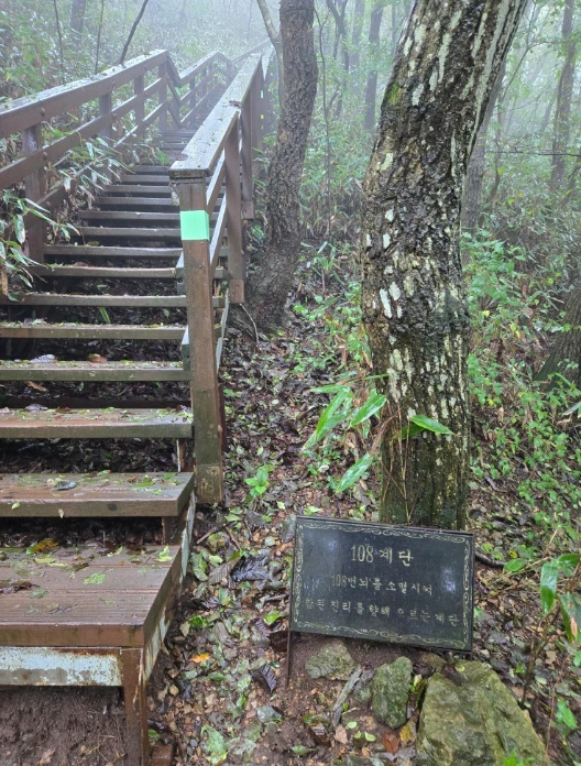 우여곡절 끝에 정상 인증 사진을 남기고 구수재 방향으로 하산하기 위해 108계단을 내려가던 도중에 청라산악회 미녀삼총사(산너울님, 아가타님, 멋진 인생님)와 조우하고 인사를 간단히 나눈 후에 일행들과 함께 구수재 방향으로 하산길에 올랐다.