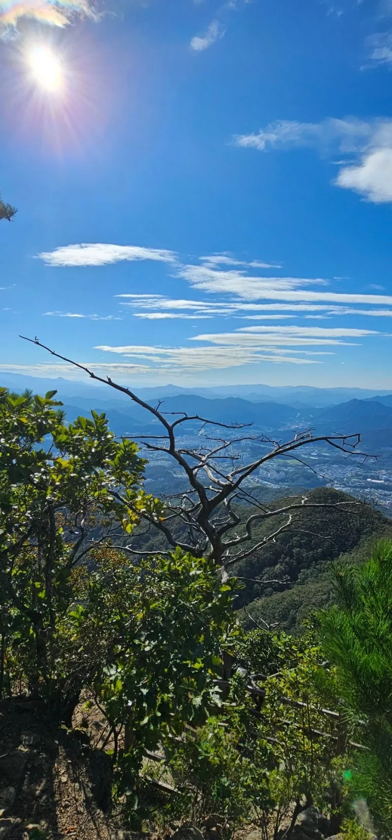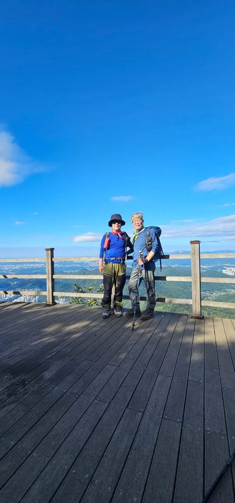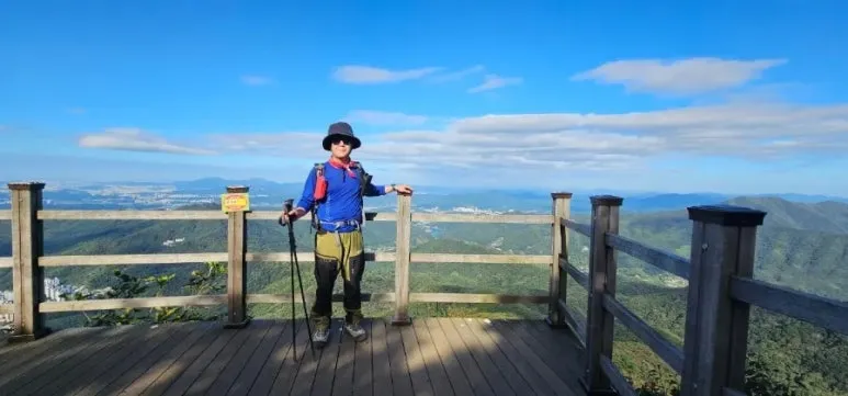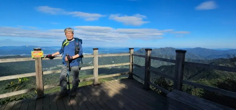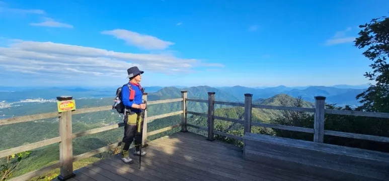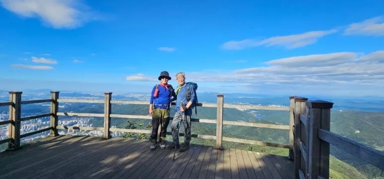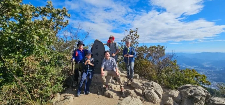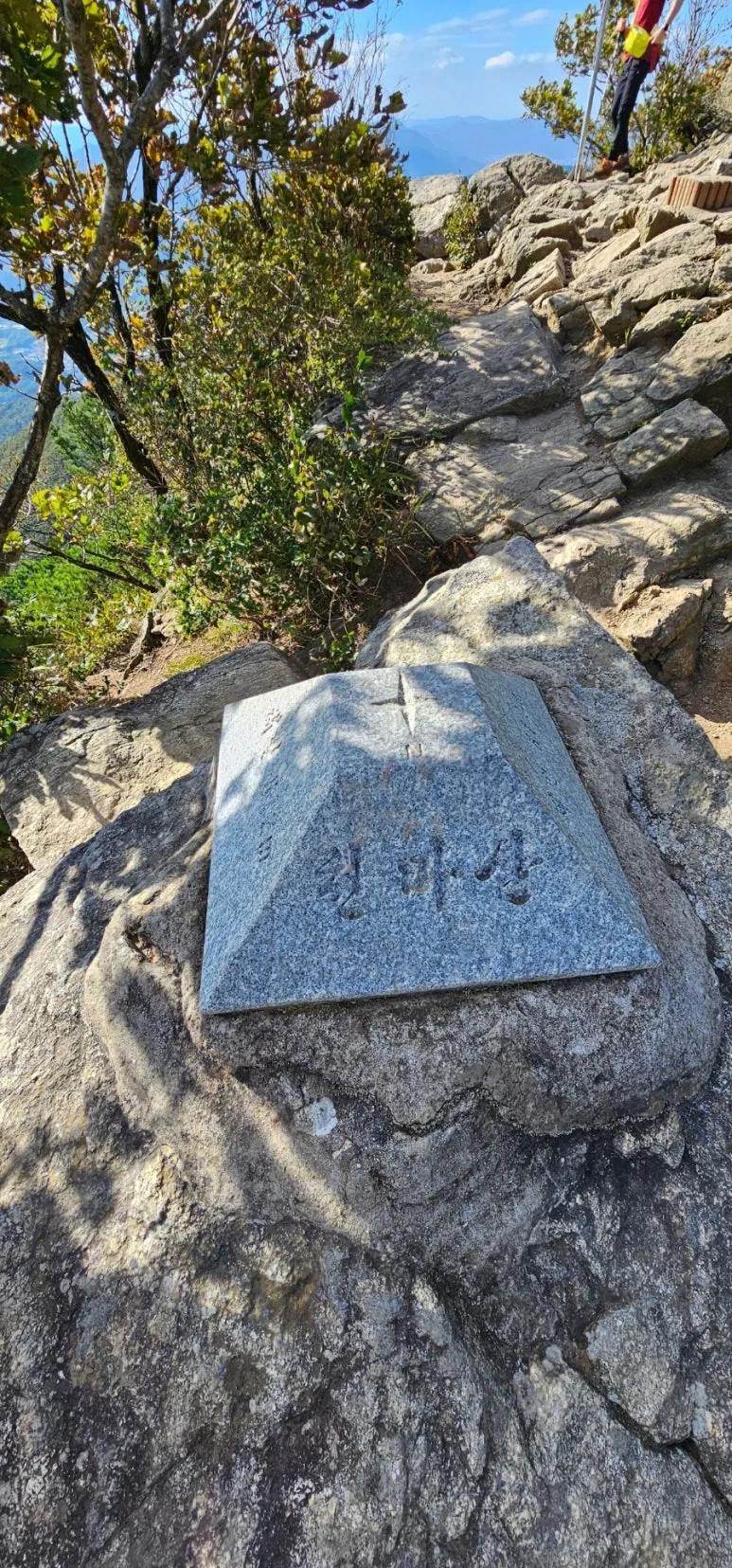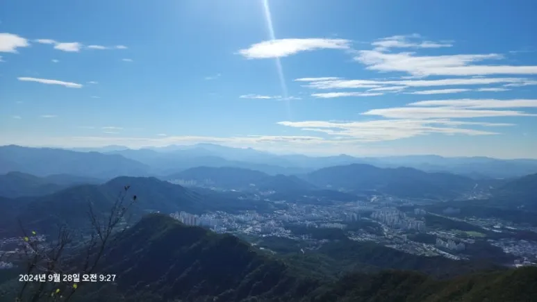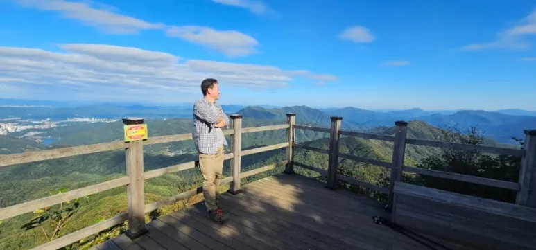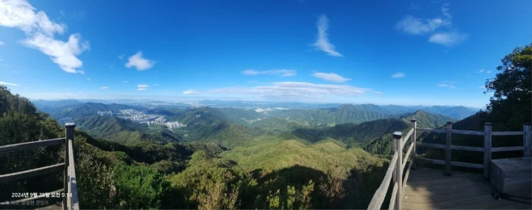 고도 640m 지점에 나뭇잎으로 뒤덮이고 풀이 무성한 상태로 방치된 헬기장에서 급경사의 데크 계단과 정성껏 쌓아 올린 돌탑, 야수 바위, 사람 인(人)자 형상의 꺽정 바위를 지나자 멀리 북한산, 도봉산, 계양산과 예봉산을 비롯하여 서울 근교의 모든 산을 바라볼 수 있는 조망이 탁 트인 전망대에 도달할 수 있었다. 후에 정상에서 하산하면서 전망대에서 화사한 가을 햇살 아래에서 즐거운 간식 시간을 가졌다.