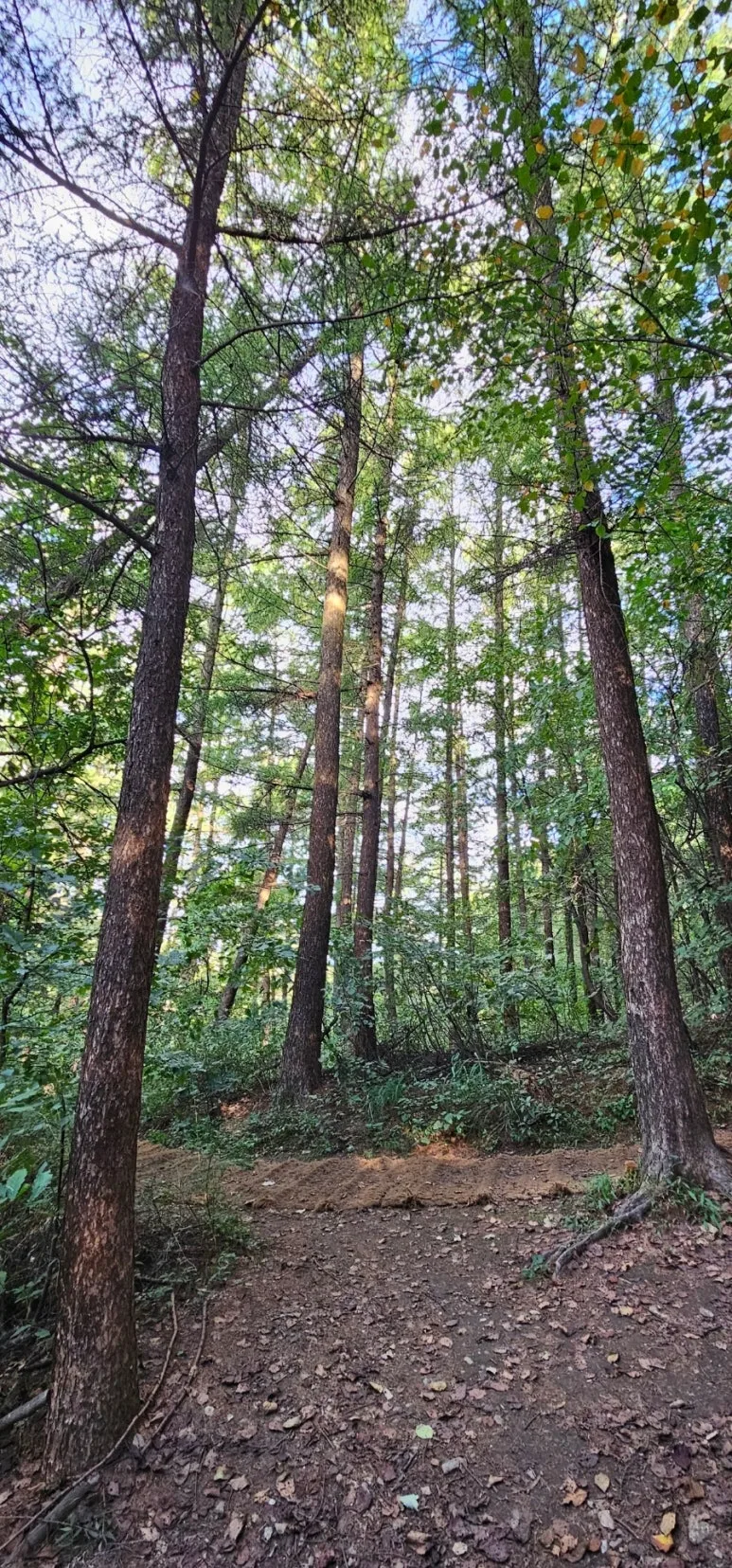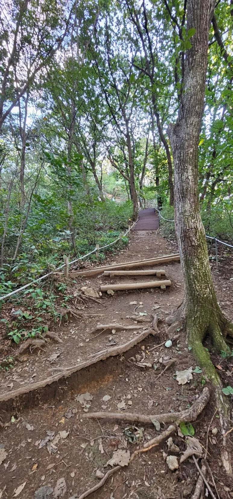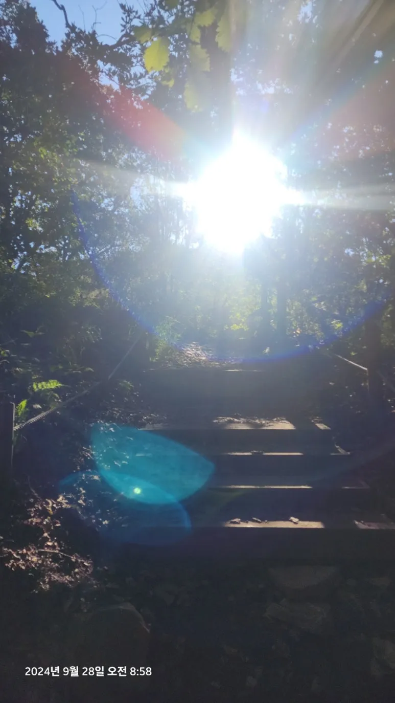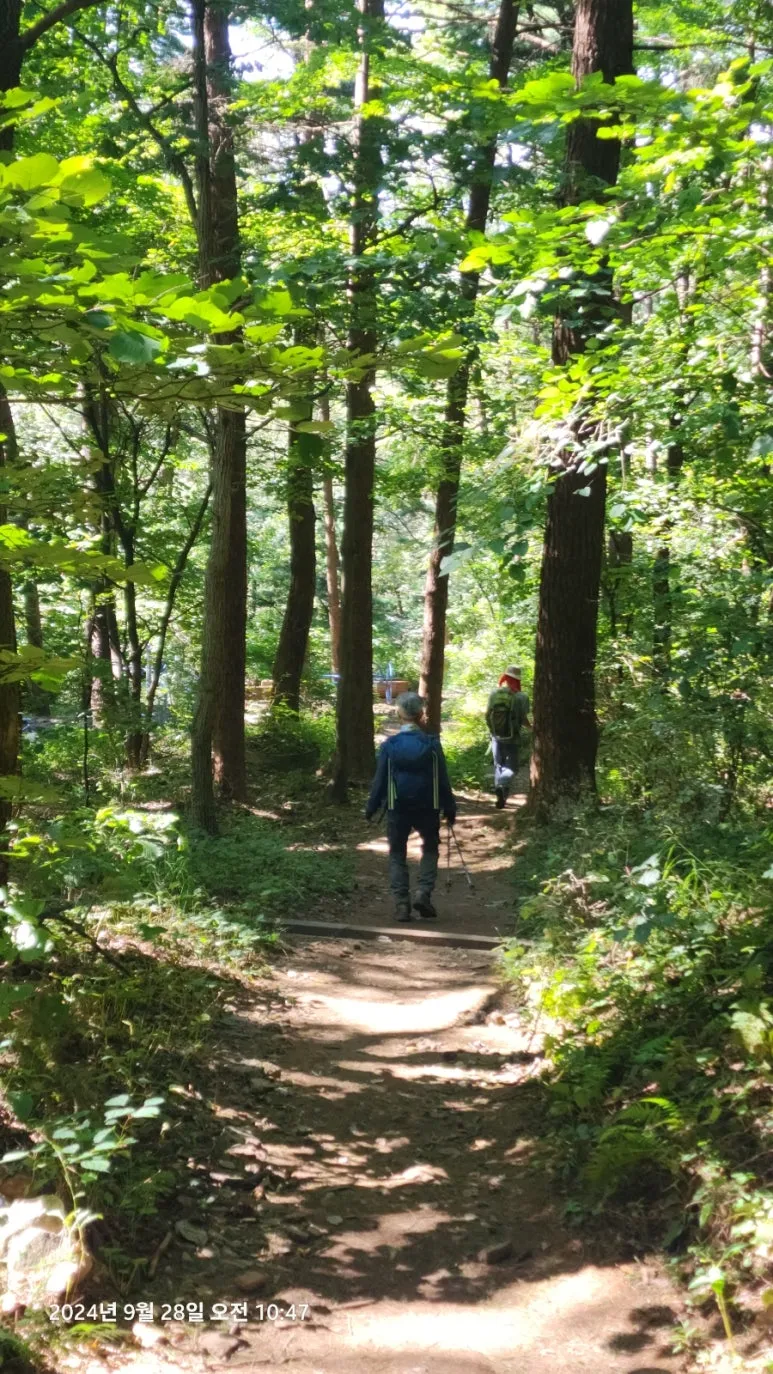 마당재 콘크리트 포장의 마당재에서 정상으로 향하는 등산로에 들어서자 하늘로 곧게 뻗은 빽빽한 나무숲이 시원한 그늘을 만들어 주었다. 간간이 나뭇잎 사이로 눈부신 가을 햇살이 비집고 들어와서 등산로 위에 내려 앉았다.
