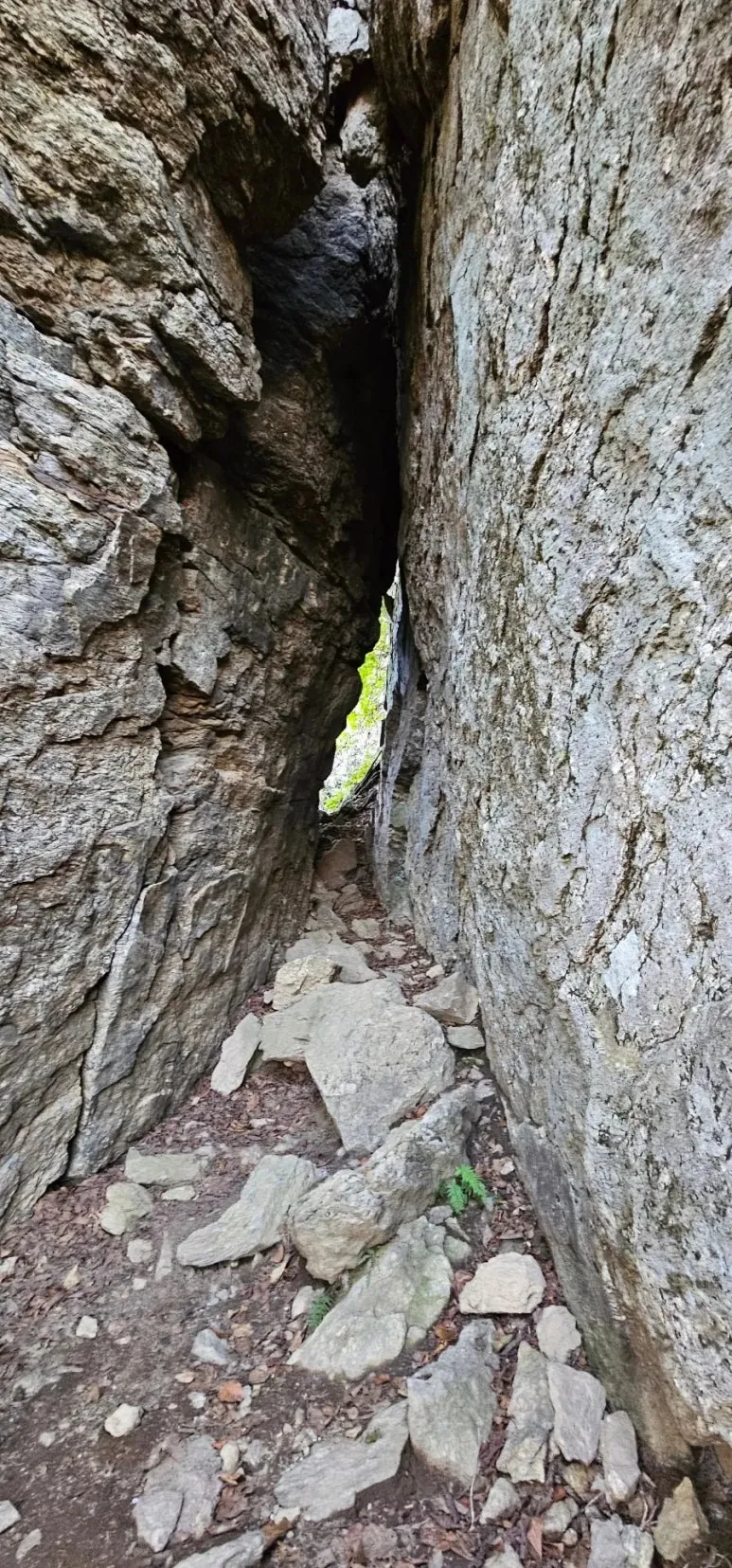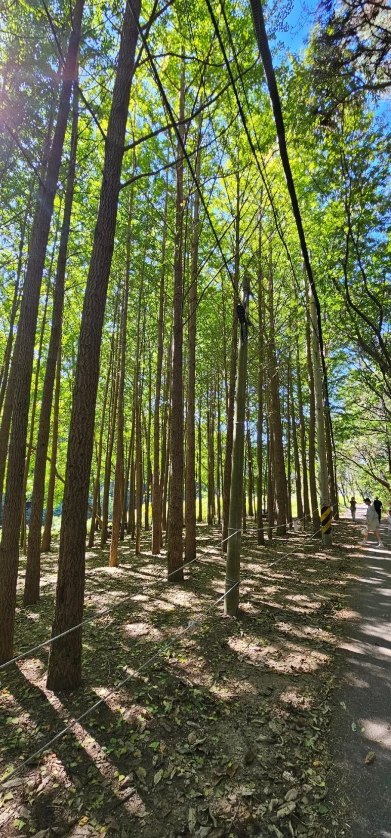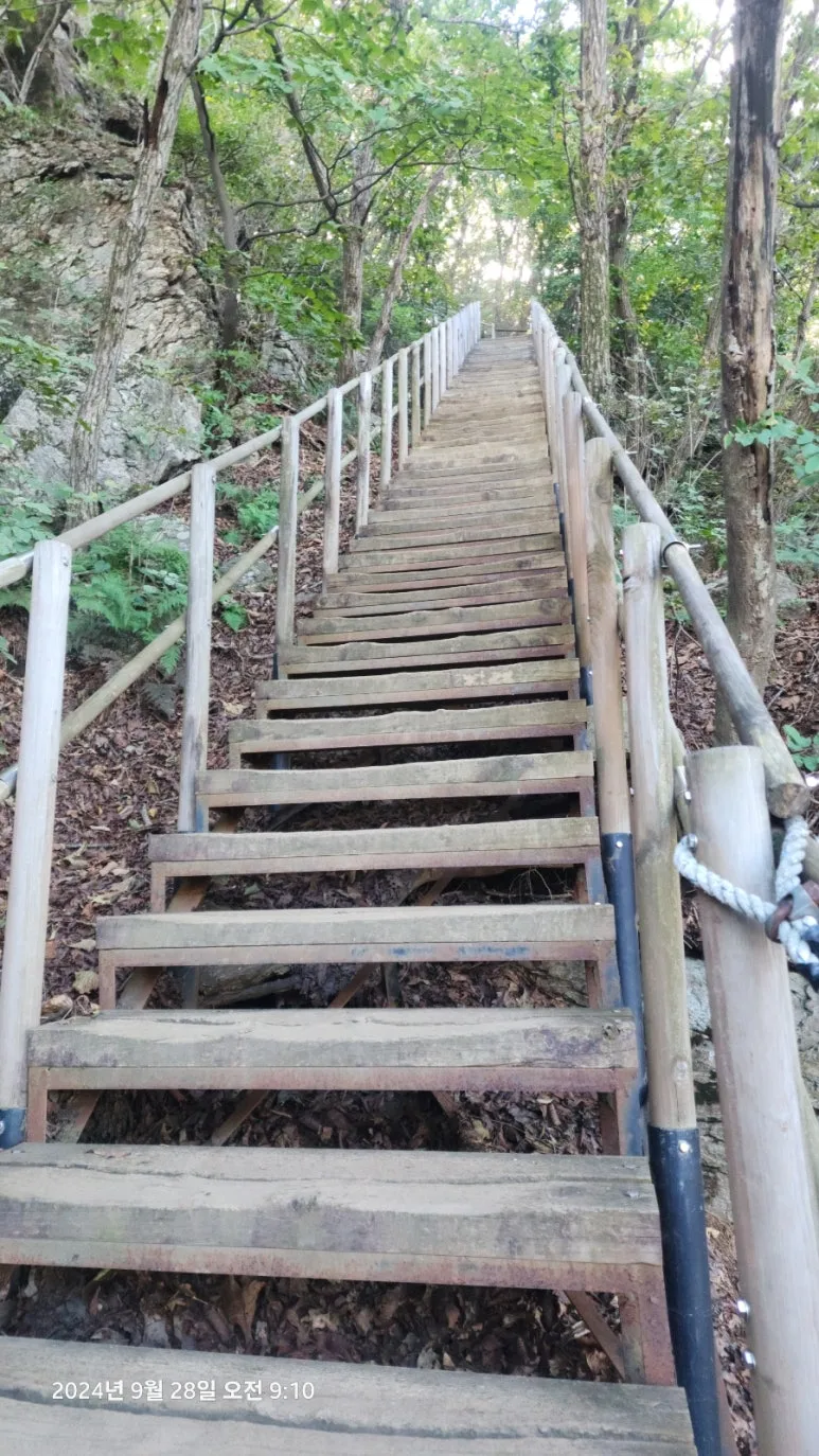 마당재 콘크리트 포장의 마당재에서 정상으로 향하는 등산로에 들어서자 하늘로 곧게 뻗은 빽빽한 나무숲이 시원한 그늘을 만들어 주었다. 간간이 나뭇잎 사이로 눈부신 가을 햇살이 비집고 들어와서 등산로 위에 내려 앉았다.