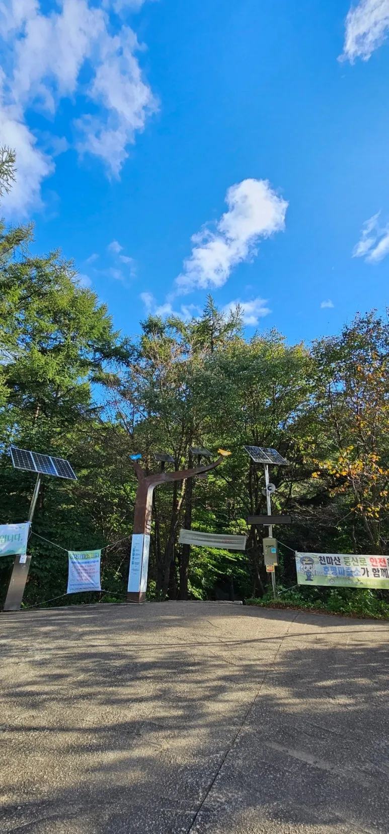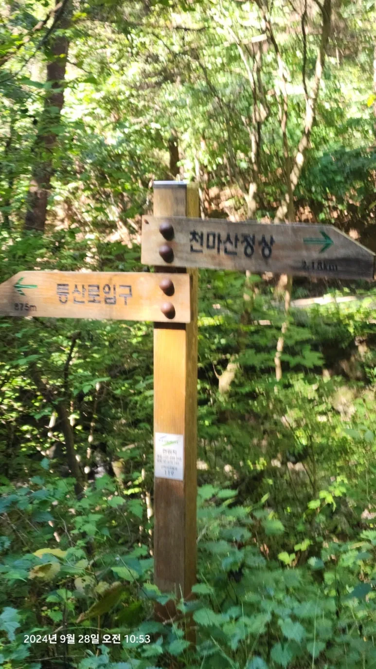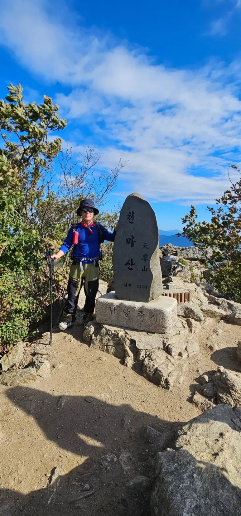 쑥부쟁이 꽃 하늘을 향해 곧게 뻗은 나무들 사이로 시원한 가을바람이 나뭇잎 사이를 가로질러 엄마의 부드러운 손길이 아기의 뺨을 살포시 감싸듯이 뺨을 스쳐 지나가면서 땀을 식혀주었다. 계곡의 물소리와 시원한 바람을 벗 삼아 육산의 비교적 평탄한 등산로를 따라 올라 서자 콘크리트로 포장한 널따란 마당재가 맞이하여 주었다. 본격적인 천마산 등산은 이곳부터 시작이었다.