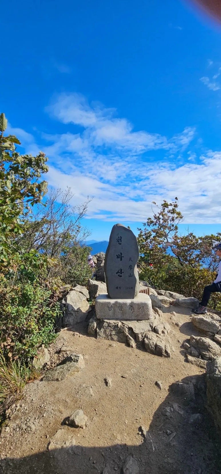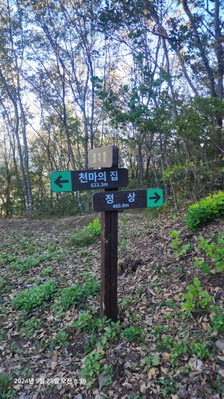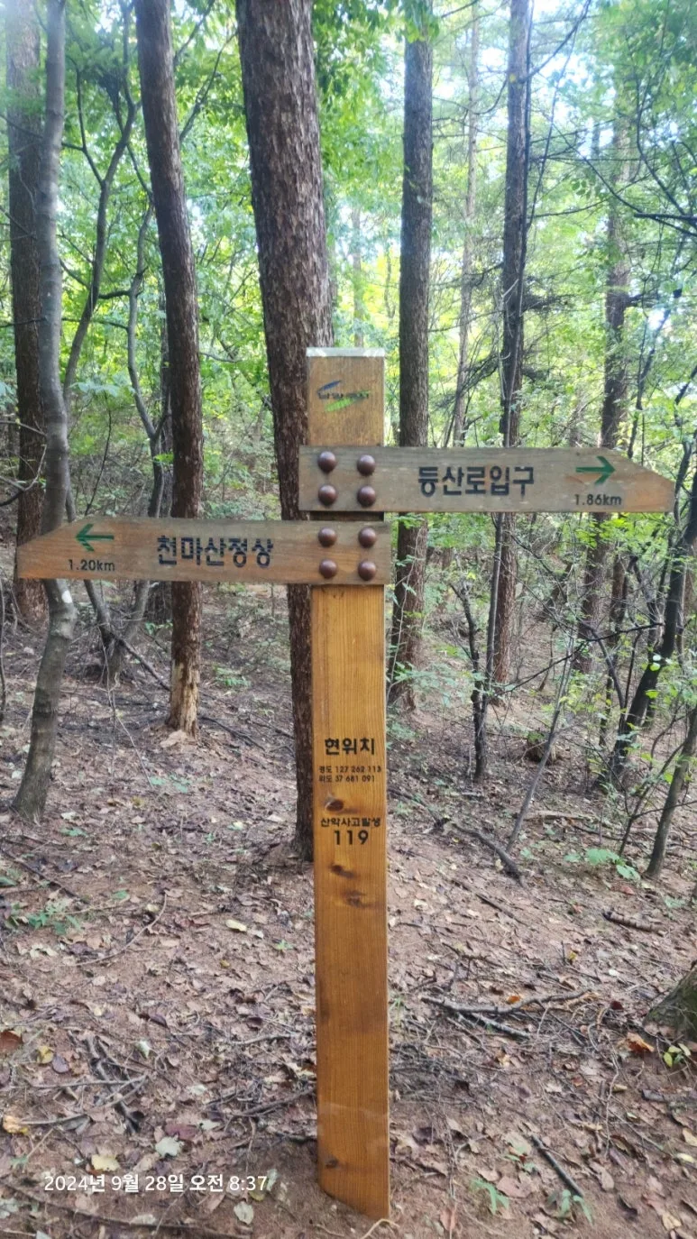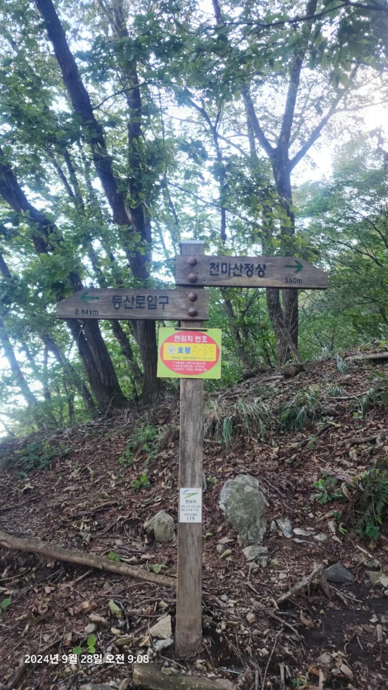 쑥부쟁이 꽃 하늘을 향해 곧게 뻗은 나무들 사이로 시원한 가을바람이 나뭇잎 사이를 가로질러 엄마의 부드러운 손길이 아기의 뺨을 살포시 감싸듯이 뺨을 스쳐 지나가면서 땀을 식혀주었다. 계곡의 물소리와 시원한 바람을 벗 삼아 육산의 비교적 평탄한 등산로를 따라 올라 서자 콘크리트로 포장한 널따란 마당재가 맞이하여 주었다. 본격적인 천마산 등산은 이곳부터 시작이었다.
