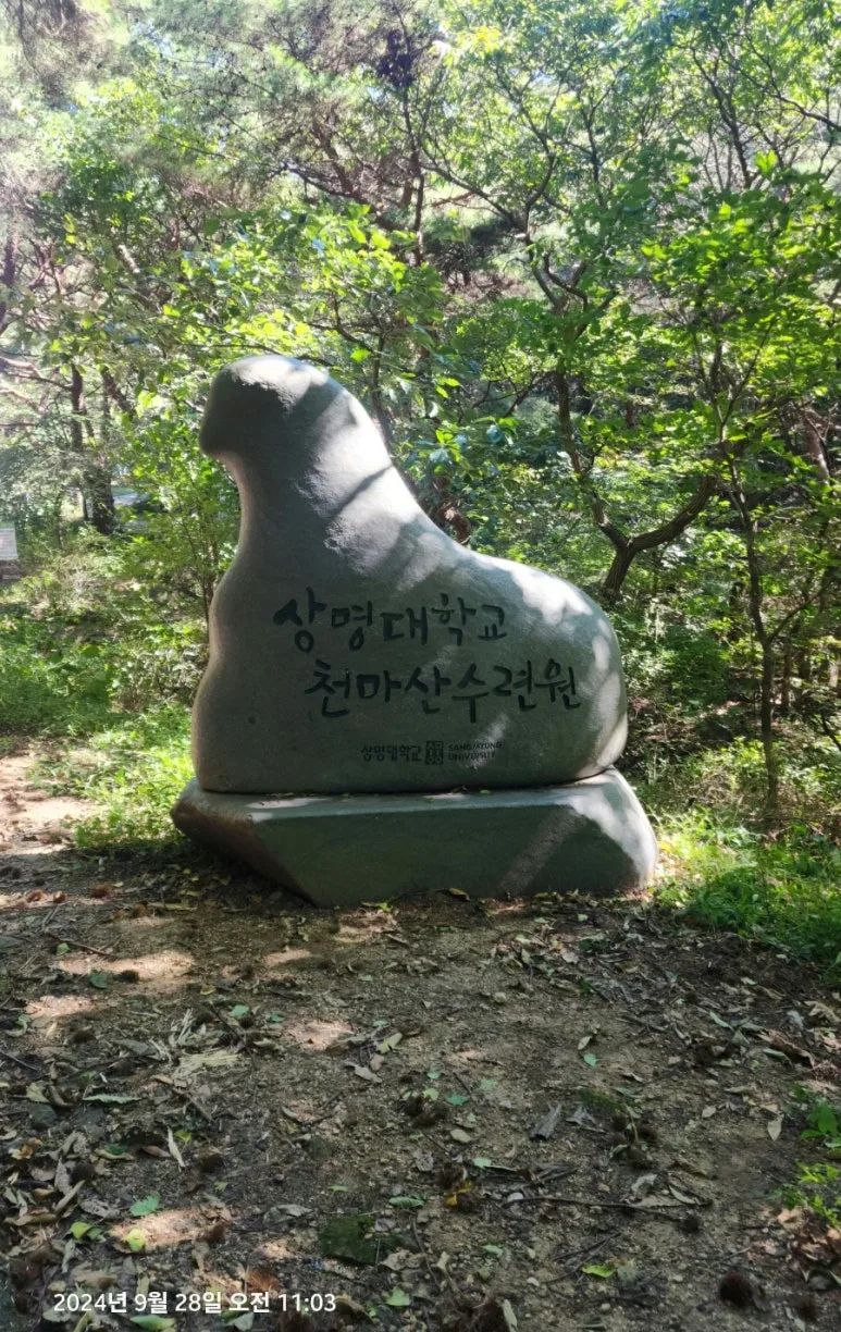 호평 공영 제1 주차장 위쪽의 '두부만드는 집' 옆으로 조성된 시멘트 포장의 임도 길을 따라 조금 오르자 '상명대학교 천마산 수련원' 표지석과 예전에 곰이 살았던 곳을 의미하는 '고뫼터' 조형물을 만날 수 있었다.