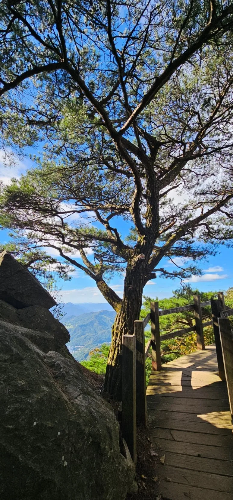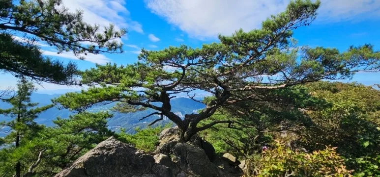 정상이 가까워지자 급경사의 데크 계단과 암릉 길이 앞을 가로막았다. 정상을 구성하고 있는 바위틈 사이로 뿌리를 내리고 오랜 시간 천마산 정상을 지키고 있는 소나무들이 멋진 자태를 마음껏 뽐내고 있었다.