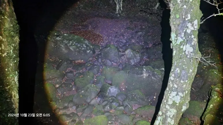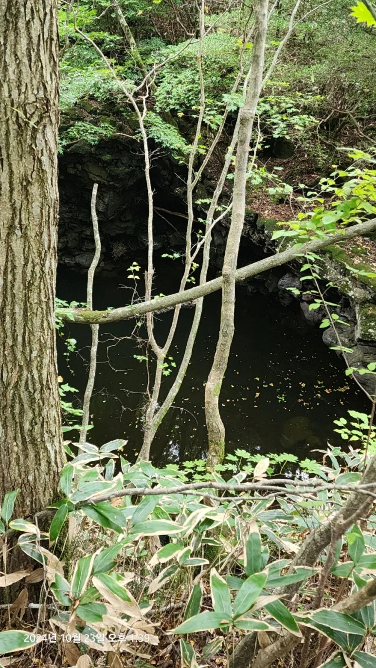 미처 렌턴을 준비하지 못한 근덕과 귀석을 앞세우고 산행 진행 중에 할 말이 많아도 아주 많은 귀석은 말을 하다 체력을 소진하며 점차 뒤로 처지기 시작했다. 어제도 비행기를 탑승하자마자 말하기 시작하여 제주에 도착할 때까지 열심히 이야기했으니 기력이 다했을 것이다. 할 수없이 근덕이와 함께 렌턴의 밝은 불빛을 함께 사용하며 산행 시작 30분가량이 지나면서 '구린굴'3)에 도착했다. '구린굴'에 도착하여 불빛으로 '구린굴'을 찾아 사진으로 남겼지만 후에 확인한 결과 사진을 촬영한 곳은 '구린굴'이 아니었다. 뒤에 쳐져있던 친구들을 기다리며 '구린굴'에서 휴식을 취한 후에 어둠에 묻혀있는 한라산을 걷기 시작하여 얼마 지나지 않아 게스트하우스에서부터 동행했던 여자 산우를 다시 만났다. 여자 산우는 자신의 등산화 끈이 풀어진 것도 모르고 걷고 있었다. 내가 헤드 렌턴으로 어둠을 밝혀 주면서 등산화 묶을 수 있도록 하여 주었다. 이때부터 서울 청계산 근처에 살고 있다는 여자 산우와 동행을 시작하였다.