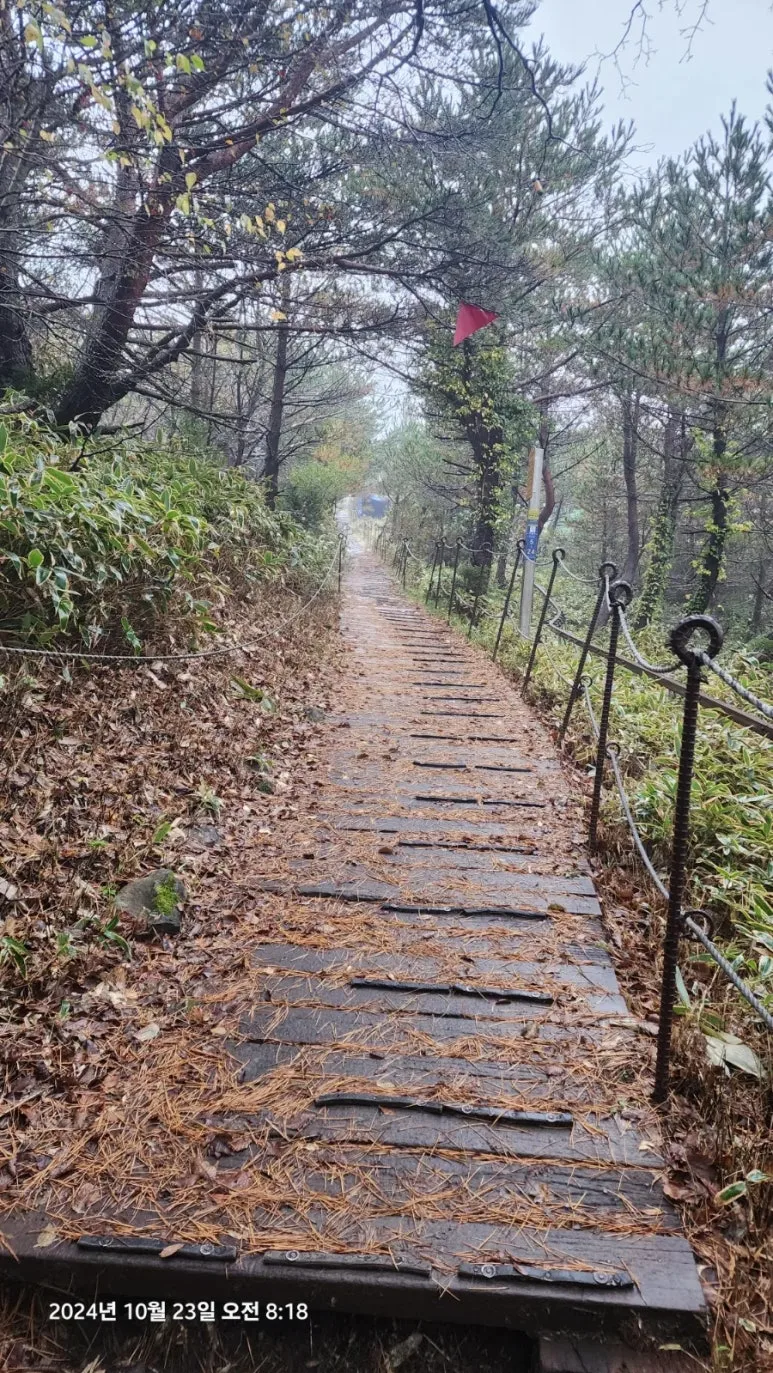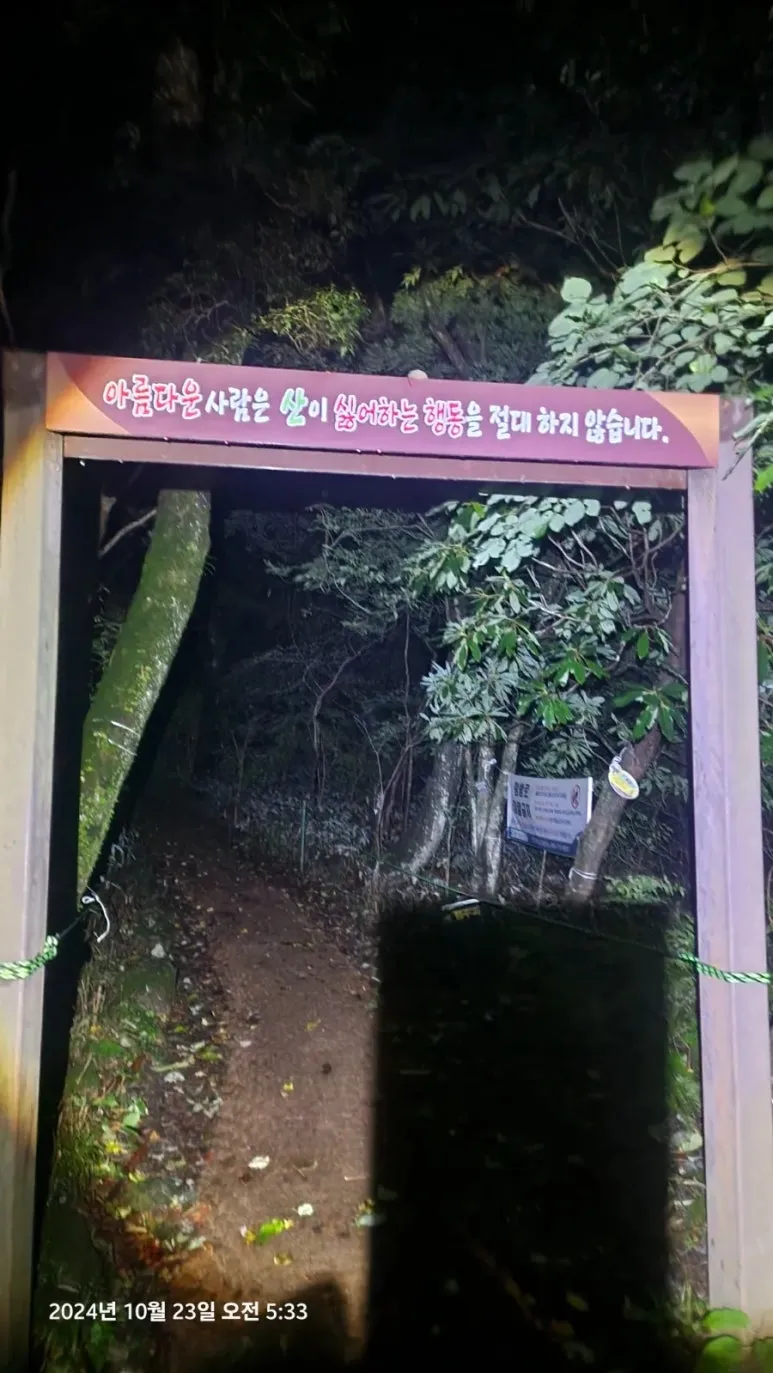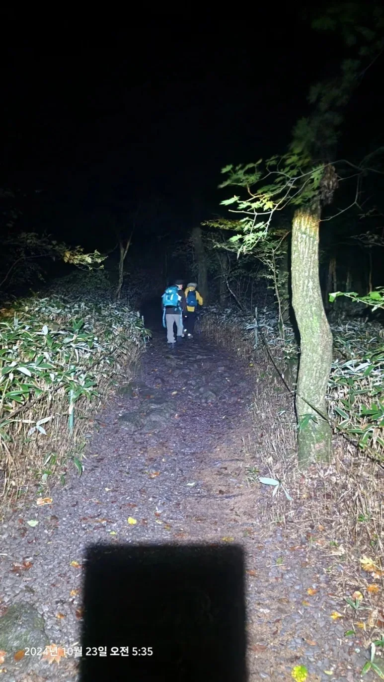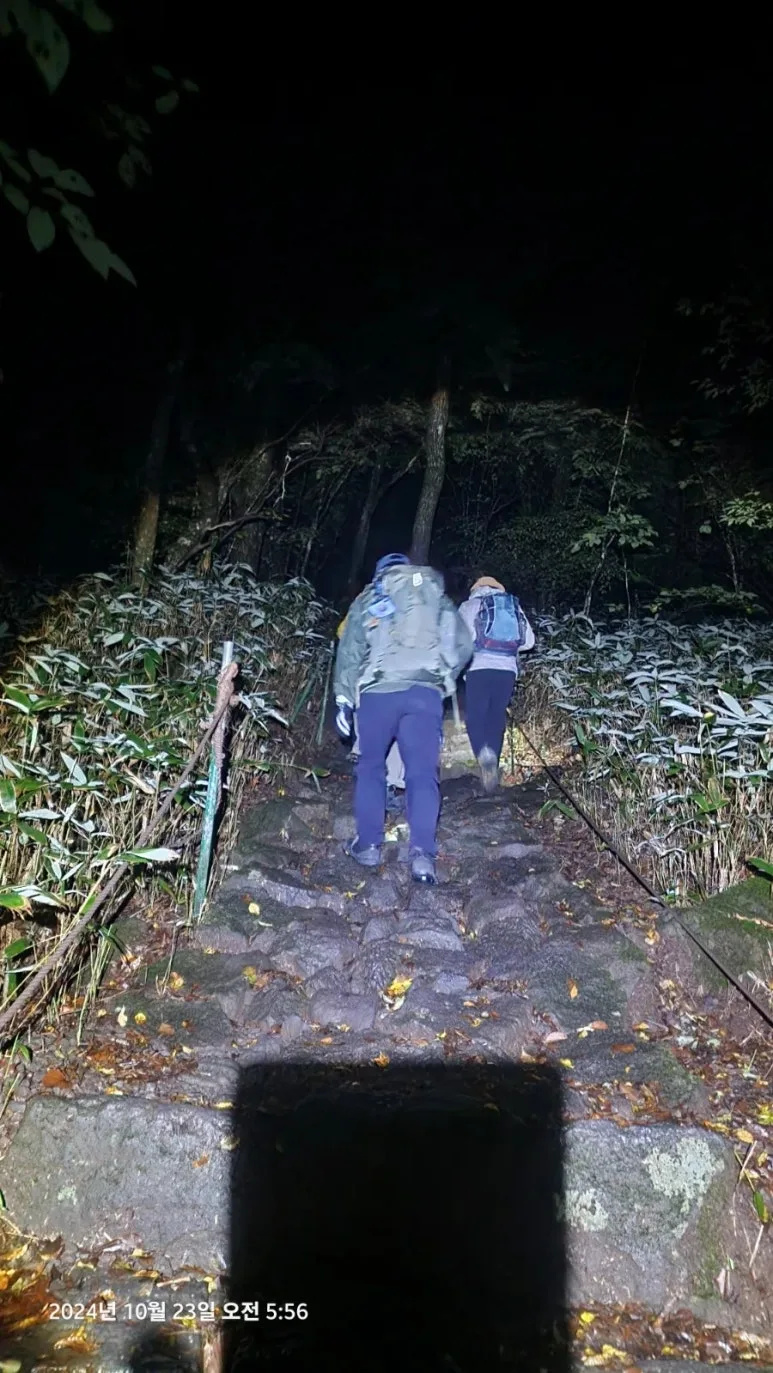 10월 23일 05시부터의 한라산 종주를 위해 이른 시간(오후 9시)에 잠자리에 들었지만 친구들의 엄청난 코 고는 소리에 밤새 뒤척이다 새벽 4시에 일어났다. 숙소에서 제공하는 미역국에 밥 한술 말아서 무말랭이 무침을 반찬 삼아 한 그릇 먹고 대충 양치와 세수를 하고 등산 준비를 하여 새벽 5시에 관음사 탐방지원센터로 출발 직전 오르다하우스로부터 한라산 부분 통제 톡이 전해졌다. 한라산 정상까지의 등반을 통제한다는 내용이었다. 그래도 삼각봉 대피소에 도착하여 기다리면 통제가 풀릴 수 있을 것이라는 기대를 하고 관음사 탐방지원센터에 도착하였다. 화장실을 둘른 후에 등산화 끈을 단단히 묶고 헤드렌턴을 켜고 한라산 국립공원 직원에게 탐방예약 QR과 신분증을 확인시키자 직원은 '삼각봉 대피소까지만 등반가능 하다'는 안내를 한다. 직원의 안내를 뒤로 한 채 본격적인 산행을 위해 어둠을 뚫고서 등산로 입구에 들어서자 야자매트가 깔린 등산로가 기다리고 있었다.