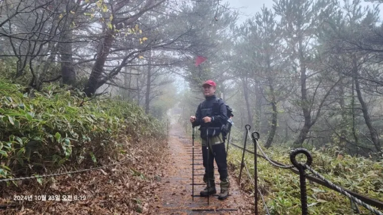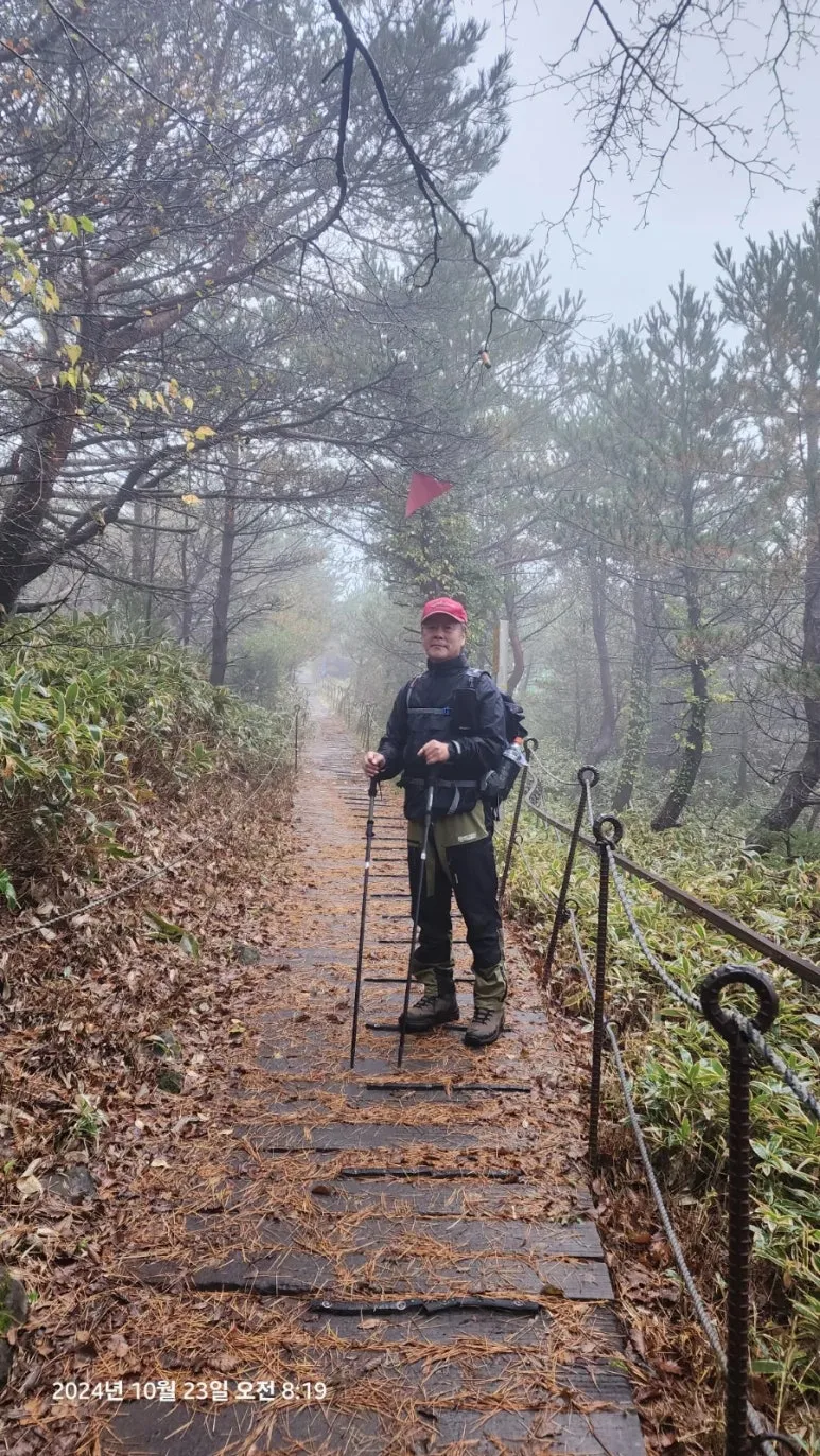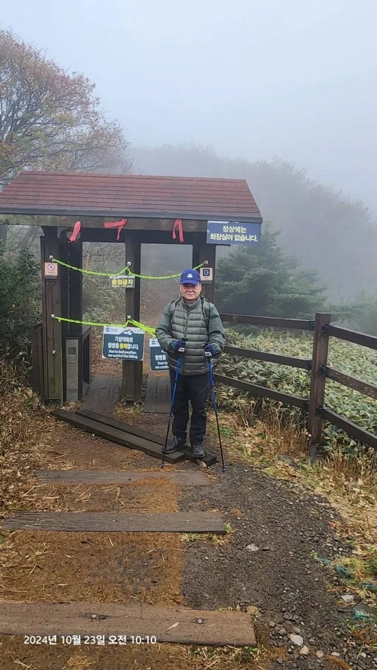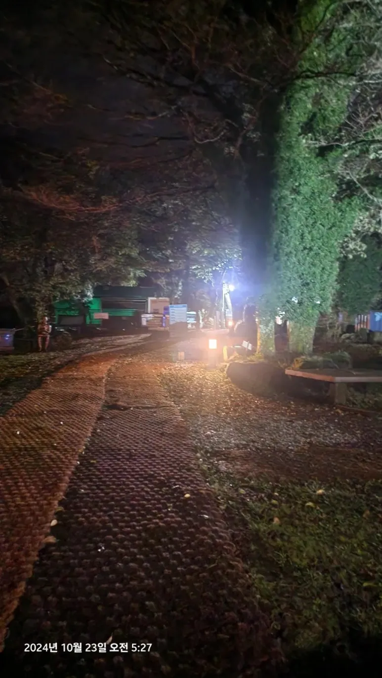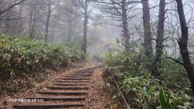 10월 23일 05시부터의 한라산 종주를 위해 이른 시간(오후 9시)에 잠자리에 들었지만 친구들의 엄청난 코 고는 소리에 밤새 뒤척이다 새벽 4시에 일어났다. 숙소에서 제공하는 미역국에 밥 한술 말아서 무말랭이 무침을 반찬 삼아 한 그릇 먹고 대충 양치와 세수를 하고 등산 준비를 하여 새벽 5시에 관음사 탐방지원센터로 출발 직전 오르다하우스로부터 한라산 부분 통제 톡이 전해졌다. 한라산 정상까지의 등반을 통제한다는 내용이었다. 그래도 삼각봉 대피소에 도착하여 기다리면 통제가 풀릴 수 있을 것이라는 기대를 하고 관음사 탐방지원센터에 도착하였다. 화장실을 둘른 후에 등산화 끈을 단단히 묶고 헤드렌턴을 켜고 한라산 국립공원 직원에게 탐방예약 QR과 신분증을 확인시키자 직원은 '삼각봉 대피소까지만 등반가능 하다'는 안내를 한다. 직원의 안내를 뒤로 한 채 본격적인 산행을 위해 어둠을 뚫고서 등산로 입구에 들어서자 야자매트가 깔린 등산로가 기다리고 있었다.