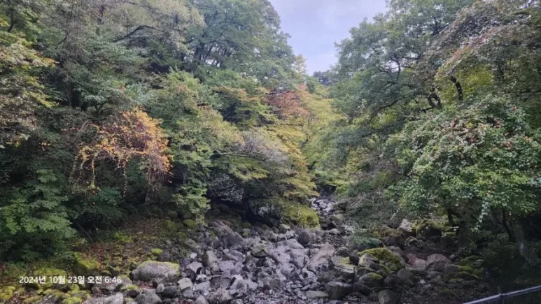 탐라계곡4) 목교에 도착할 즈음에 한라산은 어둠에서 완전히 벗어나 있었다. 탐라계곡은 계곡이란 이름에 걸맞지 않게 물은 흐르지 않는 건천이었지만 계곡 양쪽의 숲은 아름답기에 충분했다.