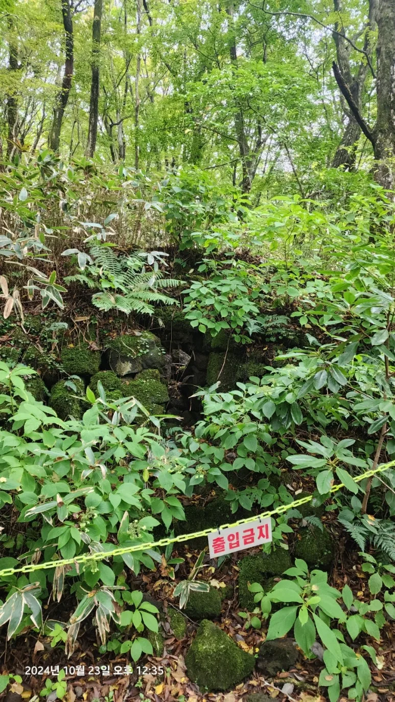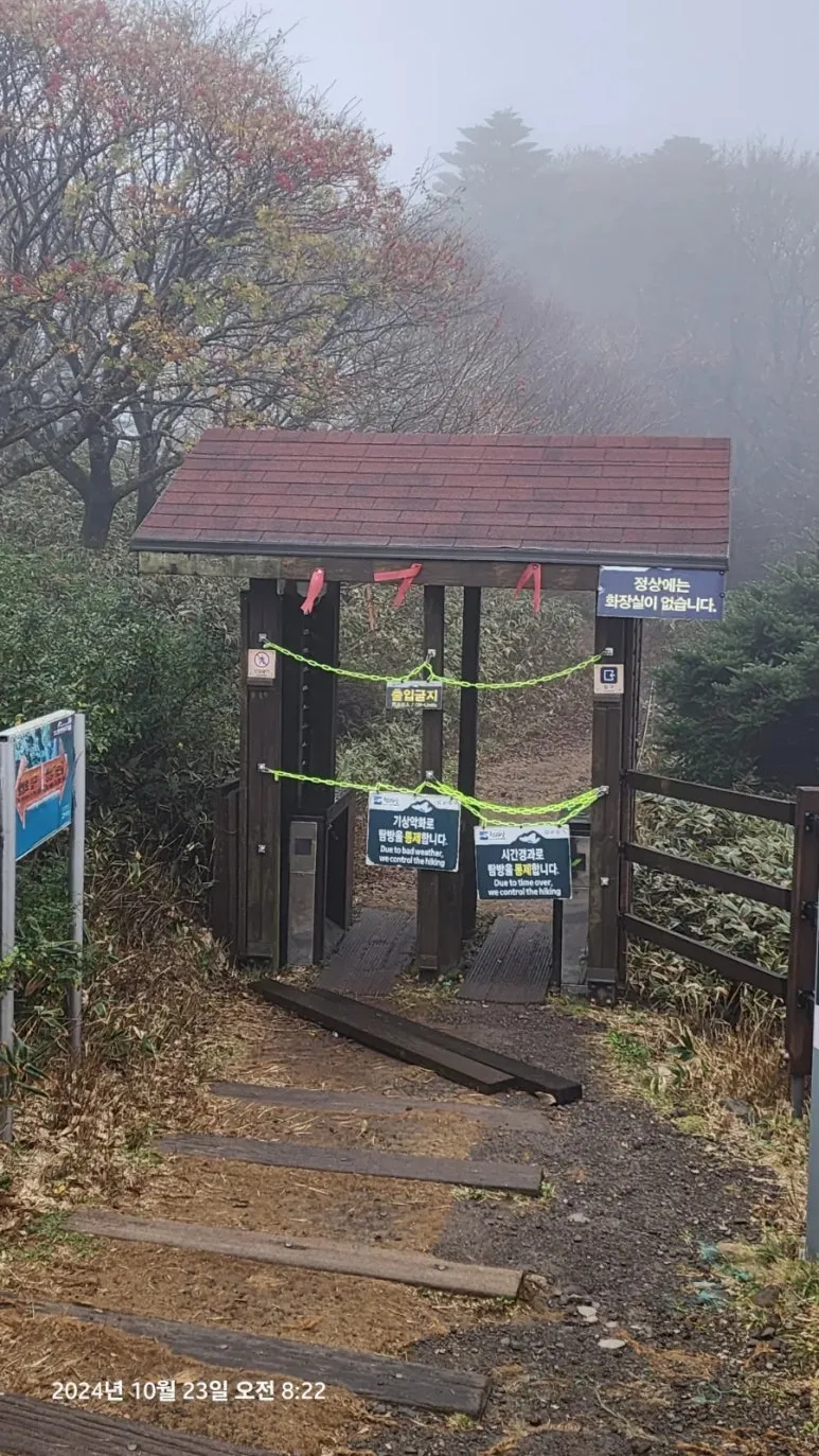 삼각봉 대피소에서 백록담을 가는 입구에는 야속하게도 '출입통제'와 '기상 악화로 탐방을 통제'한다는 안내문이 길을 가로막고 더 이상 백록담으로 한 발자국도 진행할 수 없었다. 삼각봉 대피소 안에는 10여 명 남짓의 등산객이 컵라면과 김밥을 먹으면서 통제 해제를 기다리고 있었다. 우리도 혹시나 하는 마음과 통제 해제를 간절히 원하는 마음으로 주위의 사람들과 같이 백록담에서 점심으로 먹을 김밥을 먹으면서 시간을 보냈다.