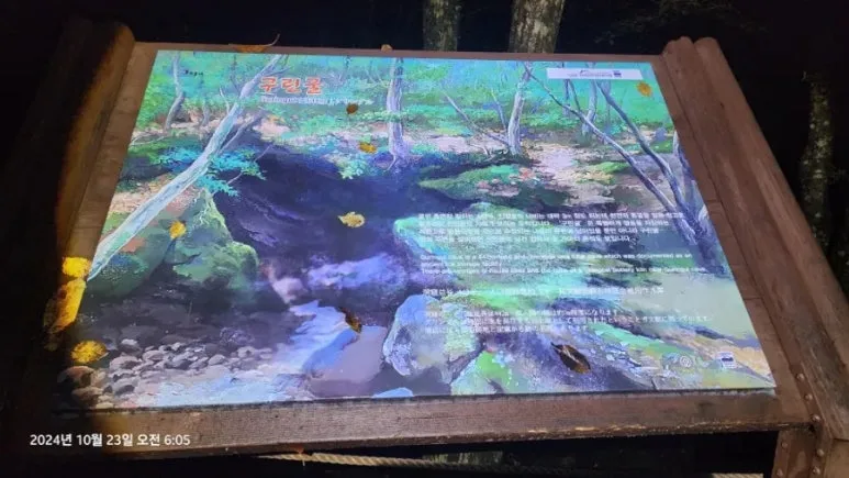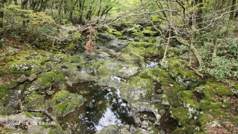 하산 길에는 어둠 뒤에 숨어 있어 미처 보지 못했던 해발 1,000m 안내석, 숯가마터, 구린굴의 모습, 이끼가 덮인 계곡에 고인 물 등을 볼 수 있었다.