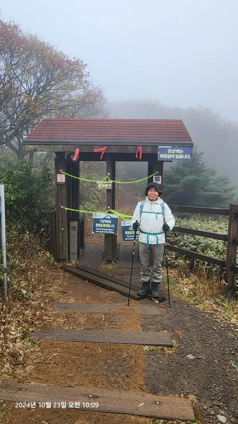 10시까지 1시간 40분을 기다려도 통제는 풀리지 않았다. 한라산 국립공원 직원이 오늘은 통제가 풀리지 않을 것이니 대피소에서 식사를 마친 등산객들은 하산하라고 독려를 하여 아쉬움을 가슴을 담고 삼각봉 대피소와 백록담 등산로 입구를 배경으로 기념사진만을 남기고 하산하였다.