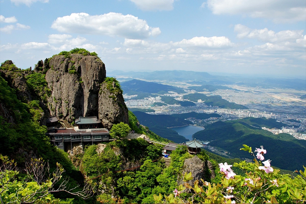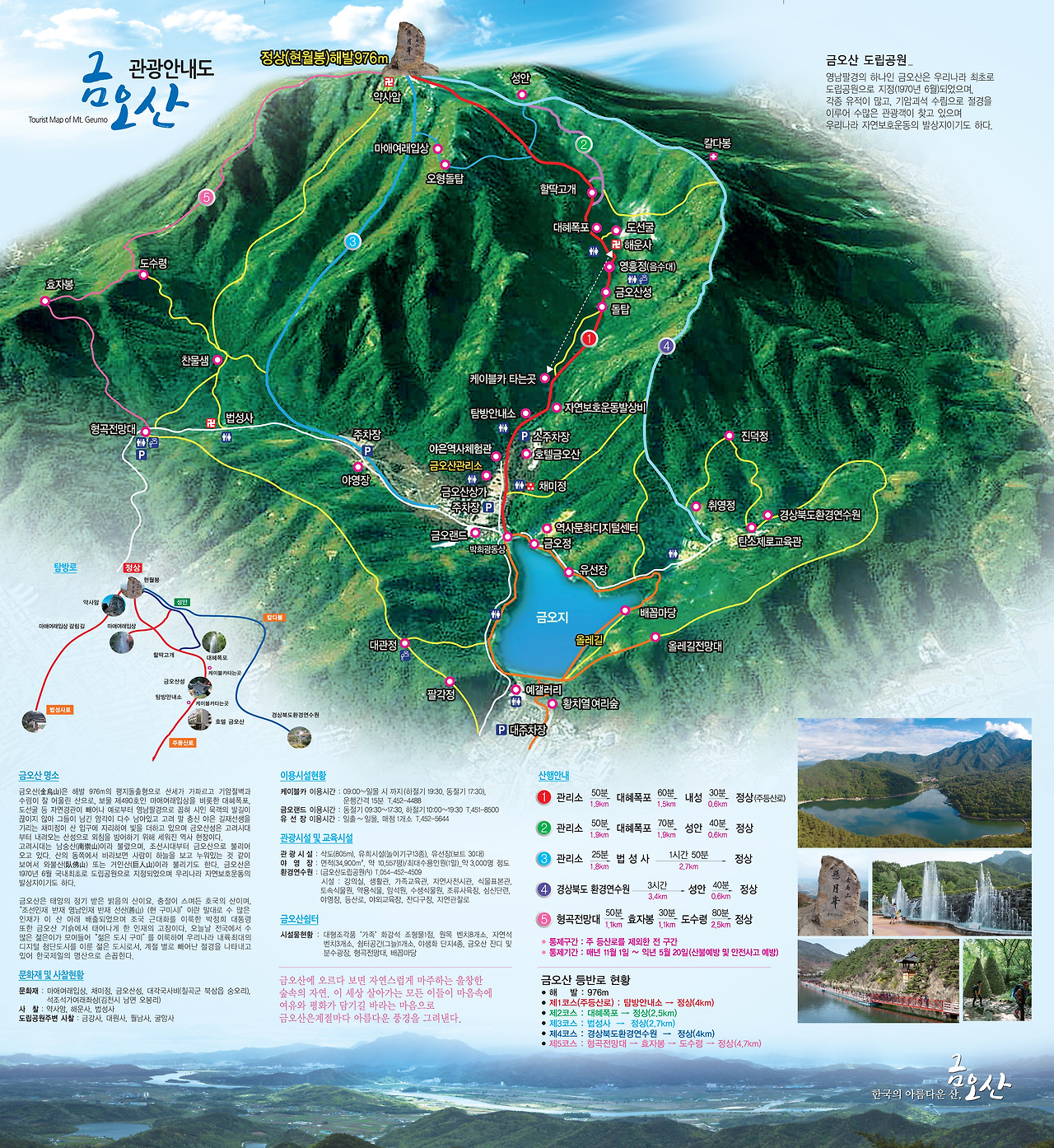 경상북도 구미의 산업 중심지에 위치한 금오산1)은 한국의 100대 명산 중 하나이자 경북 8경 중 4경에 속하는 명소이다. 1970년 6월 1일에는 우리나라 최초의 도립공원으로 지정되었으며, 구미 지역에 큰 이익을 준다는 대혜 폭포, 풍수지리의 대가 도선국사2)가 깨달음을 얻었다고 전해지는 도선굴, 그리고 보물 제490호로 지정된 5.5미터 높이의 마애보살 입상, 의상대사3)가 창건한 약사암 등 다양한 볼거리로 유명하다. '금오산'이라는 이름은 황금빛 까마귀가 선형물 속으로 날아드는 모습을 본 아도 스님이 태양의 정기를 받은 산이라 하여 붙여졌다고 한다.