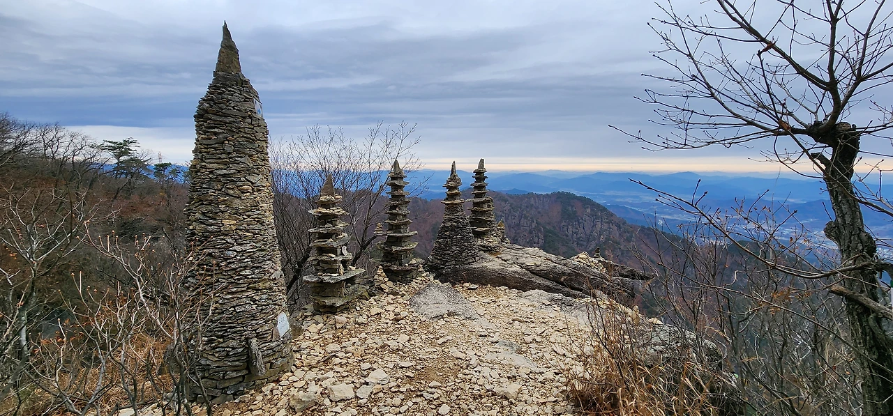 성안과 마애석불 사이의 정상 분기점에 도달했다. 여기서 오형돌탑과 약사암 방향으로 나아갔다.너덜바위길을 거쳐 상대적으로 경사가 완만한 길을 걸어서 오형돌탑에 도착했다.