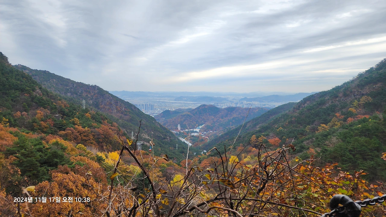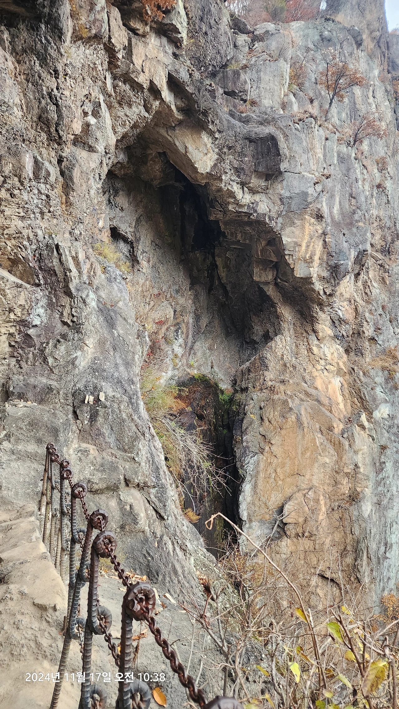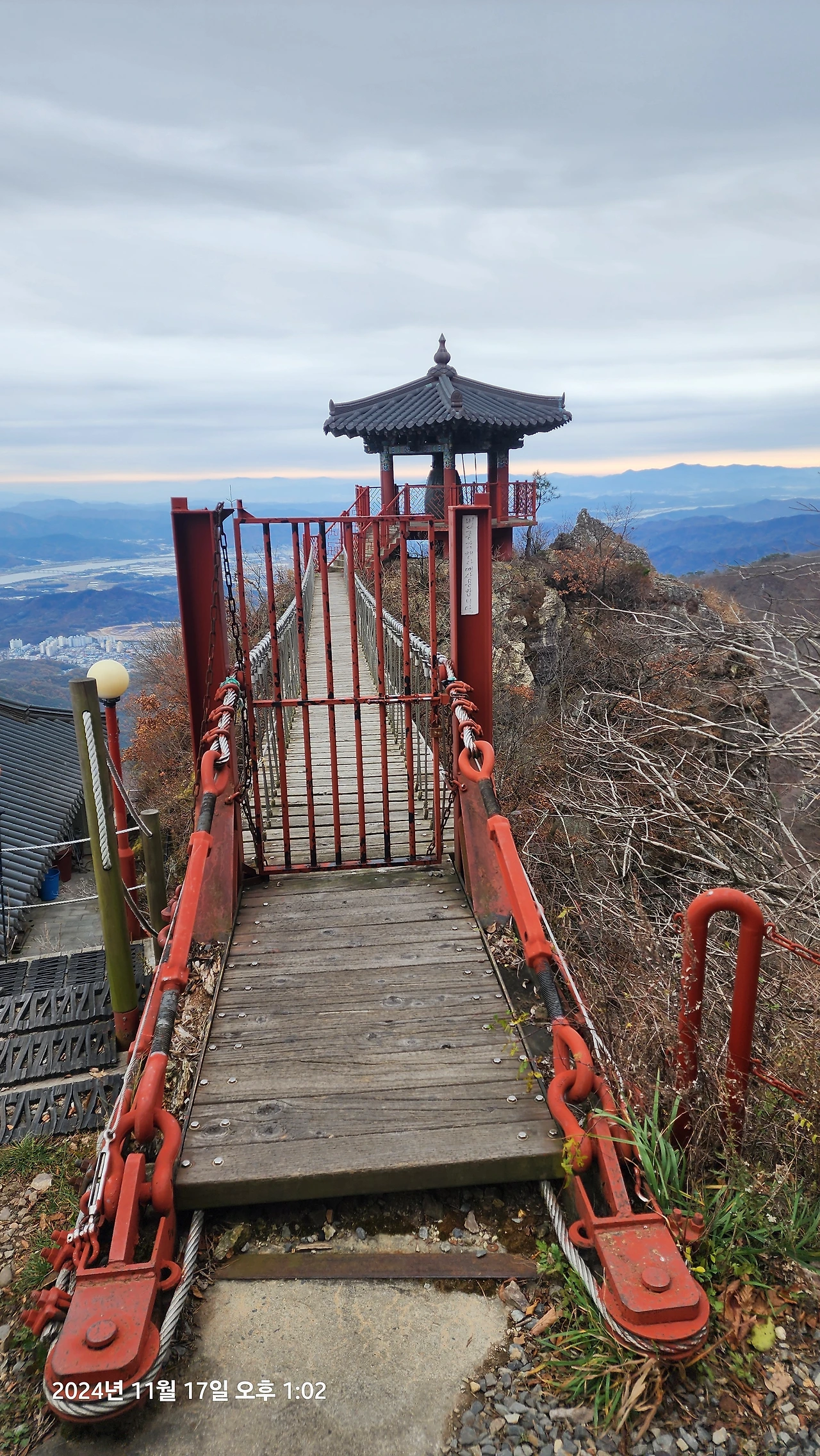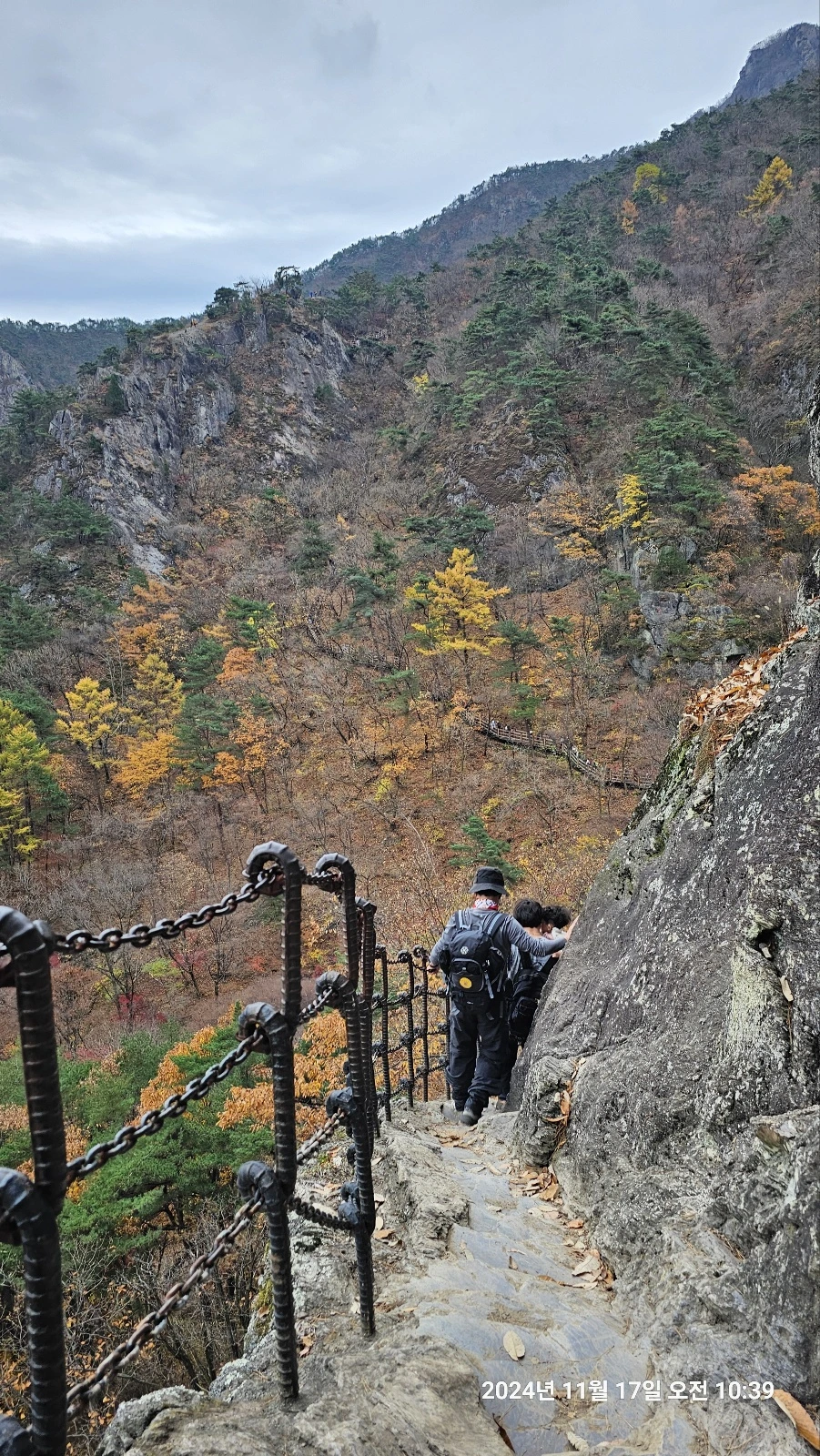 해운사 앞에 위치한 계단을 통해 정상과 도선굴로 이어지는 갈림길에 도착했다. 이 길에서 직진하면 대혜폭포와 정상으로 이어지는데 우회전하여 도선굴로 향했다. 도선굴로 가는 길은 천길 낭떠러지 절벽에 설치된 철근 기둥과 쇠사슬 안전시설 덕분에 안전했지만 안전시설 아래는 보기만 해도 아찔했다. 절벽길을 오르면서 멀리 금오산 입구가 보이는 장관을 감상할 수 있었다.