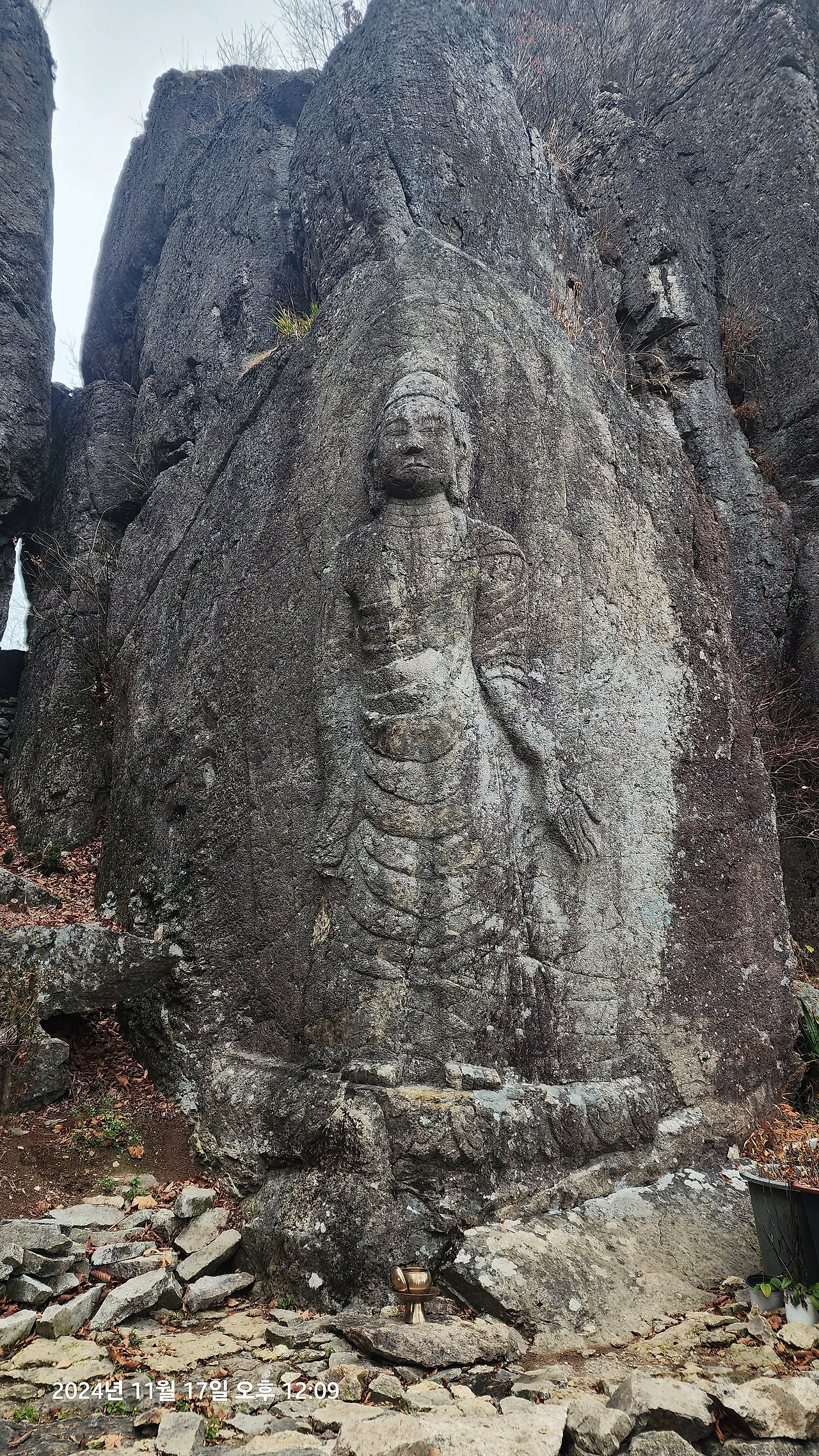 오형돌탑은 절벽 위에 세워진 정교한 돌탑이었다. 오형돌탑은 금오산의 '오'와 돌탑을 쌓은 사람의 손자인 형석의 '형'을 따서 지어진 이름이었다. 이 돌탑은 패혈증으로 세상을 떠난 손자의 영혼을 기리기 위해 할아버지가 10년에 걸쳐 법성사 방향 계곡에서 돌을 운반해 쌓은 것이라 한다. 한겨울을 연상시키는 차가운 바람이 자연스레 옷깃을 여미게 했다. 찬 바람을 뚫고 오형돌탑 인증 사진을 남긴 후, 쌍용문을 지나서 다음 목적지인 마애석불여래입상으로 발걸음을 옮겼다.
