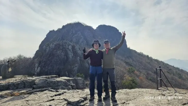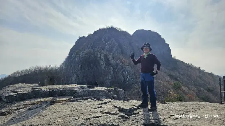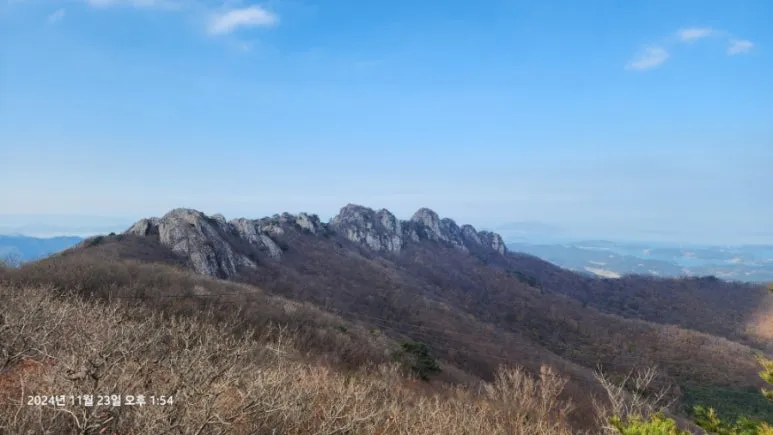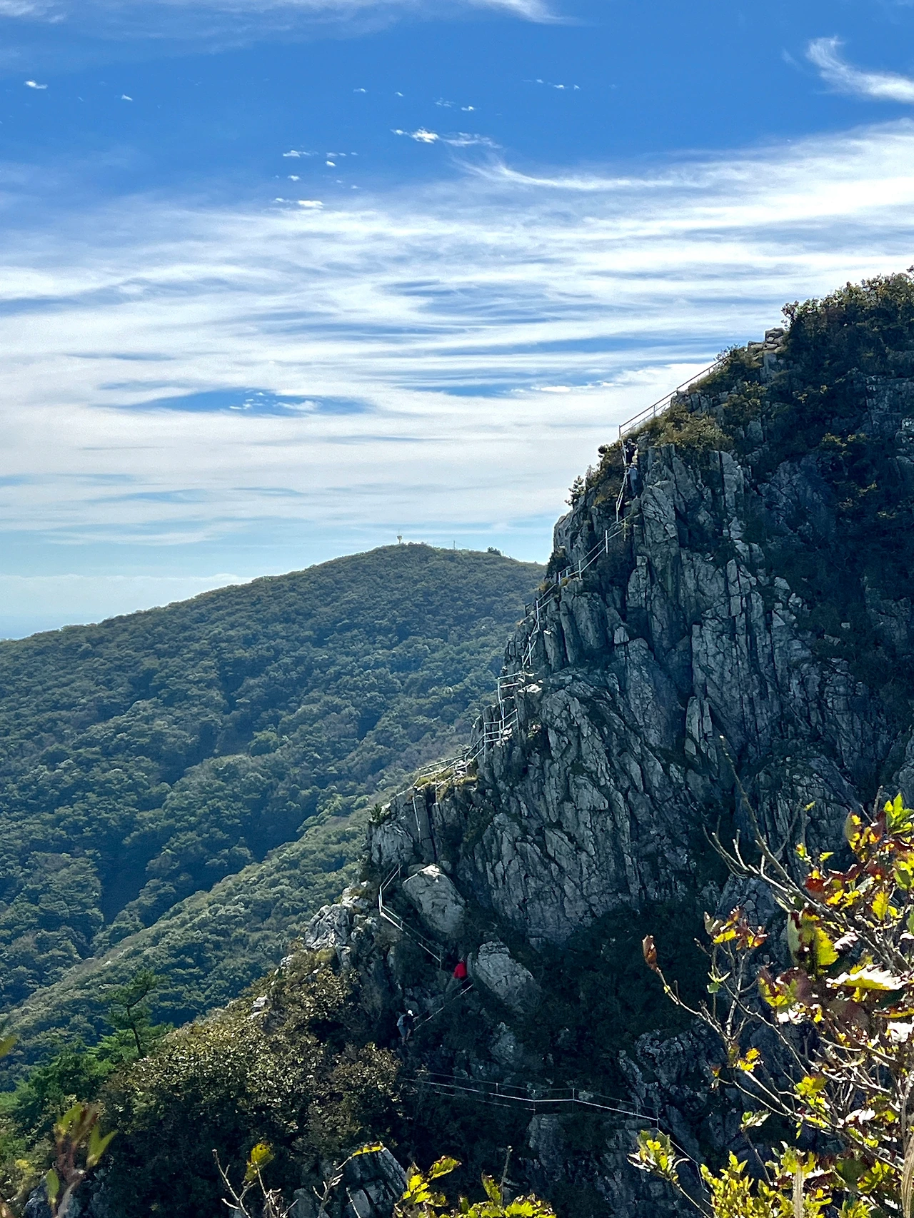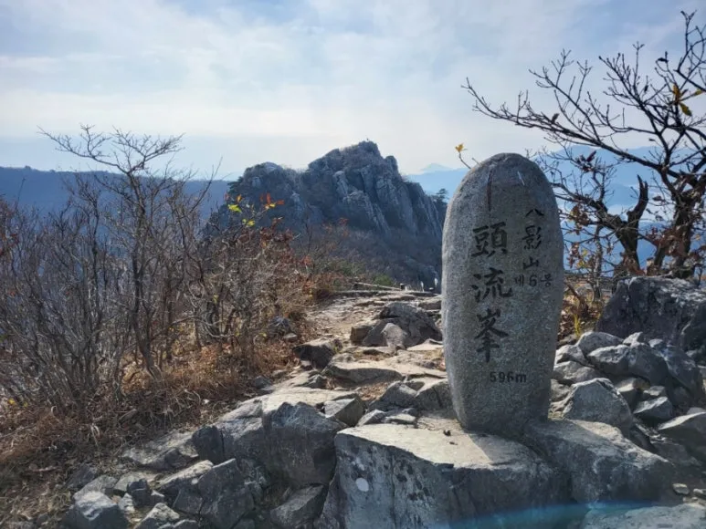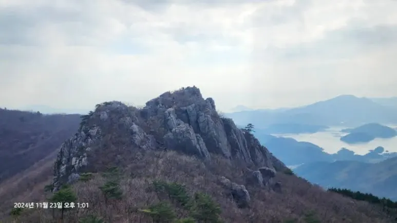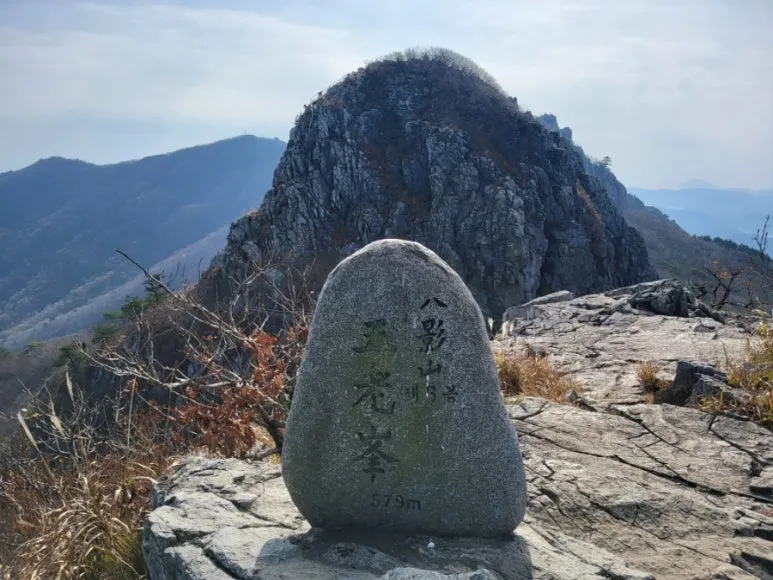 사자봉 바로 뒤에는 팔영산 봉우리 중 가장 가까운 거리에 있는 오로봉(579m)이 있었다. '다섯 명의 늙은 신선들이 놀이터로 삼았다는 전설을 가진 오로봉' 뒤로는 팔영산의 하이라이트인 두류봉이 있고, 그 뒤로는 팔영산의 정상인 깃대봉도 보였다. 사자봉에서 오로봉까지는 1분 거리로, 두 봉우리는 매우 가까이 위치해 있었다.