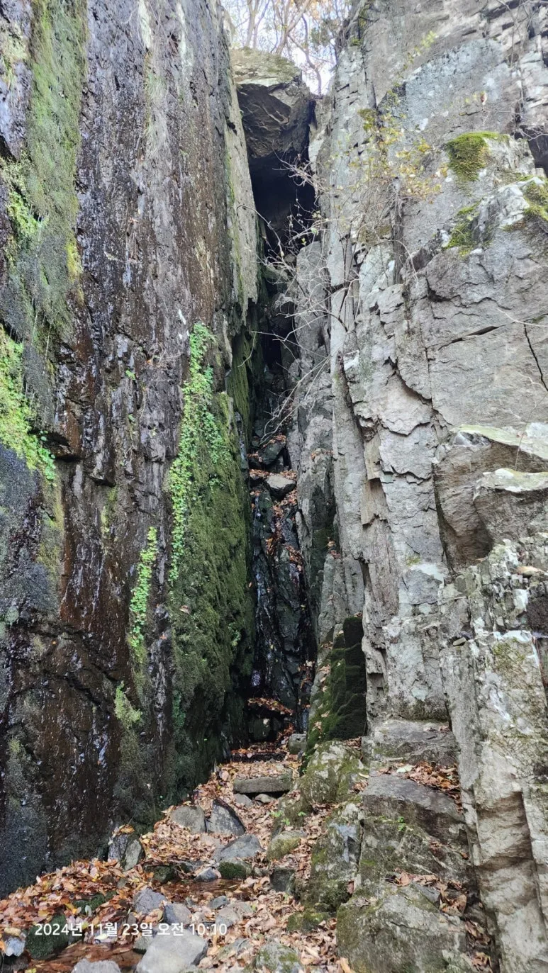 약 10분간 임도길을 따라 올라가 강산폭포에 도착했다. 강산폭포는 그 명칭에 걸맞지 않게 물이 적었지만, 물보라가 흩날리는 가운데 폭포 옆 바위면은 푸른 이끼로 덮여 있었다. 편백나무 숲의 피톤치드를 깊이 들이마시며 걷고 나서, 대나무 숲길을 지났다. 그 길을 따라 가파른 데크 계단을 오르며 첫 번째 전망대에 도달했다. 거기서 멀리 푸른 바다와 하늘이 만나는 지점에 다도해의 섬들이 아름답게 펼쳐져 있었다.