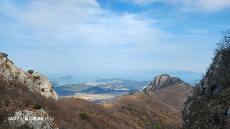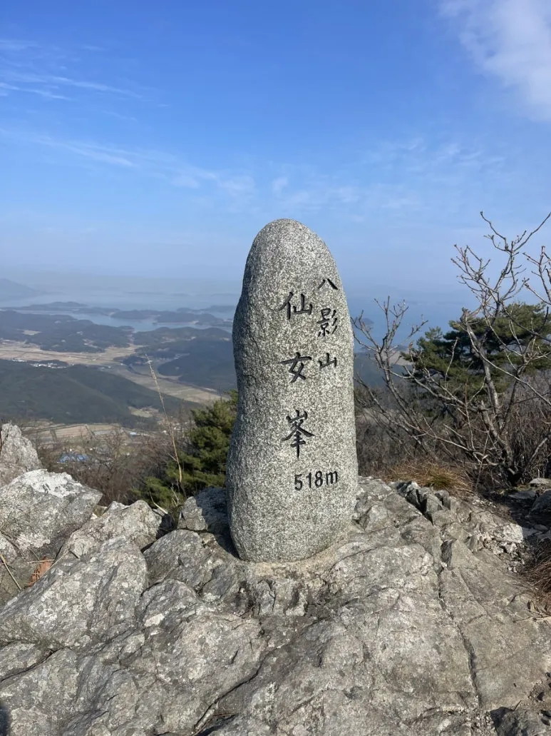 선녀봉은 단일 봉우리가 아닌 여러 봉우리로 이루어져 있었으며, 단풍으로 물든 산과 바다가 어우러져 환상적인 풍경을 이루고 있었다. 곡강에서 선녀봉까지의 2.25km 거리는 매우 가파른 경사길로, 고도를 약 520m 올리기 위해 상당한 체력을 소모해야 했다. 선녀 1, 2봉을 지나 산녀봉 정상에 서니, 멀리 팔봉산의 여덟 봉우리가 동양화처럼 아름답게 펼쳐져 있었고, 왼쪽 끝에는 깃대봉이 우뚝 솟아 있었다.