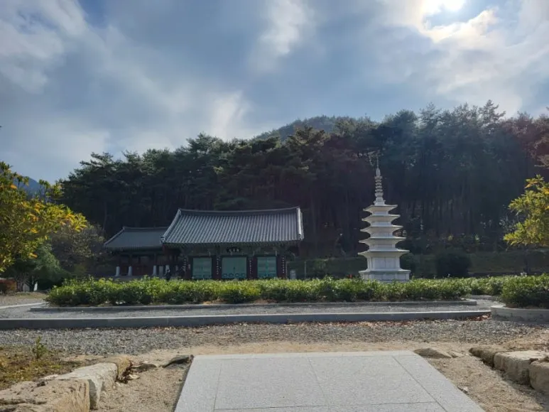 깃대봉에서 적취봉 삼거리를 거쳐 능가사2) 주차장까지 3.5킬로미터의 하산길을 서둘러 내려왔다. 임도길을 따라 내리막의 편백 나무 숲길과 팔영산 야영장을 지나 능가사에 도착했다.