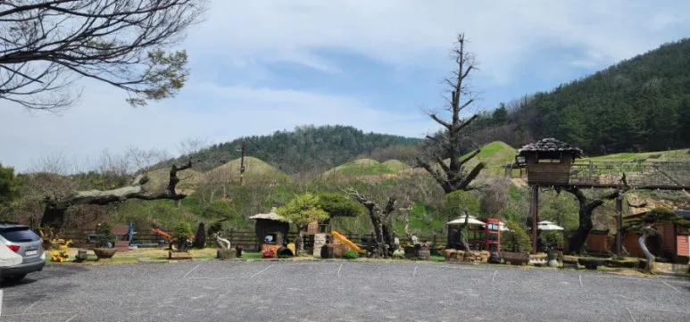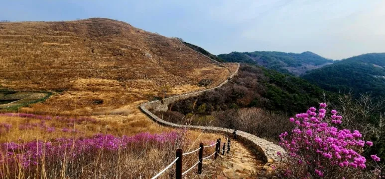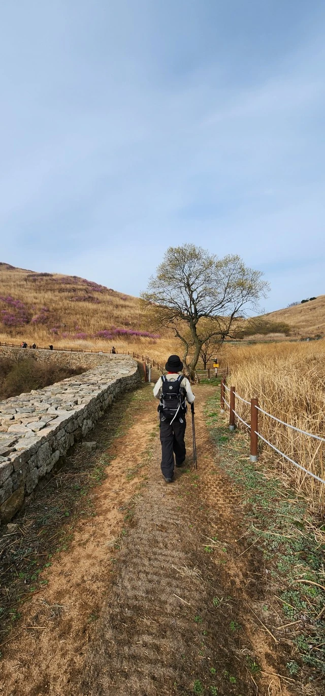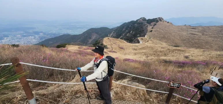 화왕산 정상으로 가는 길에 위치한 허준 촬영지를 둘러보았다. 시설물은 낡았지만, 지붕은 억새 줄기로 된 이엉으로 보수되어 상태가 양호했다. 맞은편에는 만개하지 않은 연분홍 진달래 군락지가 펼쳐져 있었다. 비류산에서 만나지 못한 진달래를 전망대에서 감상한 후 정상으로 방향을 돌렸다.