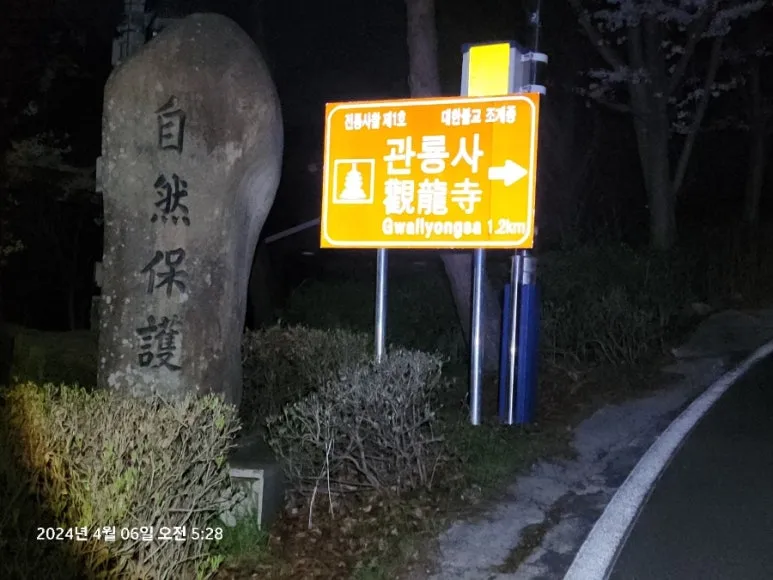 성주 휴게소에서 새벽 3시에 이른 아침을 푸짐하게(소갈빗살 구이, 한우 유부초밥, 한우 김밥, 매생이 떡국) 먹고, 새벽 5시에 옥천매표소에 도착해 화왕산 산행을 위한 관룡사로 가는 아스팔트 길을 따라 걸었다.
