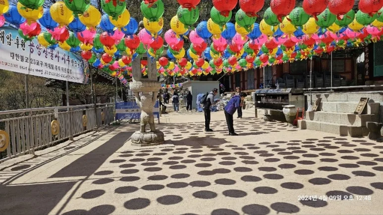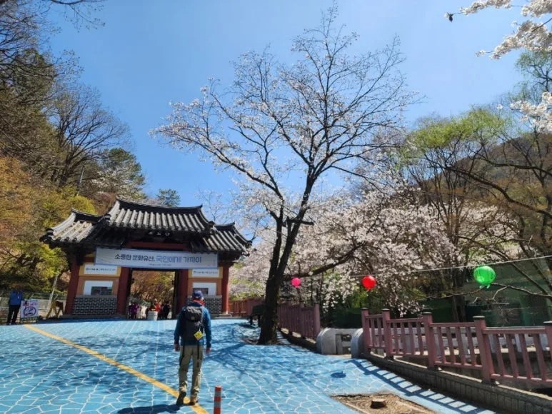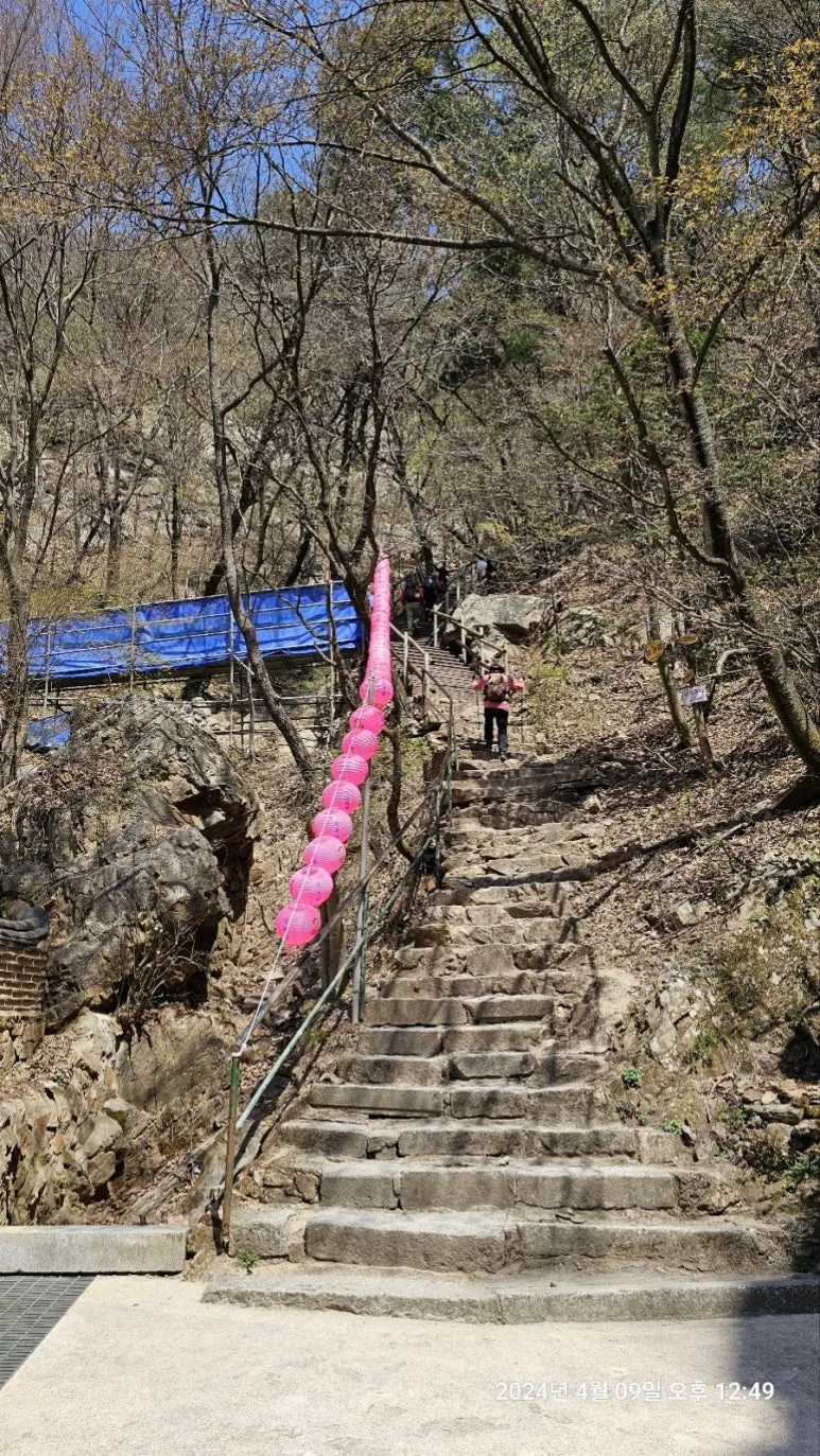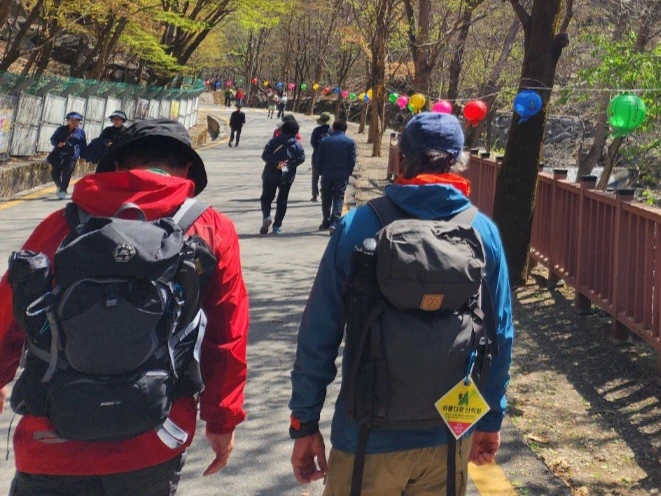 관광지원센터에서 일주문을 시작으로 자재암², 하백운대, 중백운대, 상백운대, 칼바위, 나한대, 의상대, 샘터, 구절터를 거쳐 다시 일주문으로 돌아오는 코스로 종주하기로 했다. 대부분은 공주봉을 거쳐 의상대에서 자재암 방향으로 종주하지만, 우리는 반대 방향을 선택했다. 등반 전에 잘 정비된 임도의 벚꽃길을 따라 약 1.5km를 걸으며 몸을 예열했다. 매표소를 지나면 입장료를 받던 시절이 있었으나, 현재는 무료로 개방되어 있다. 일주문을 지나 자재암에 도착하니 부처님 오신 날을 앞두고 많은 불자들과 화려한 연등이 반겨 주었다. 청량폭포에서 잠시 시원한 물줄기를 감상한 후 나한전을 끼고 왼쪽으로 조성된 등산로를 따라 본격적인 산행을 시작하였다.