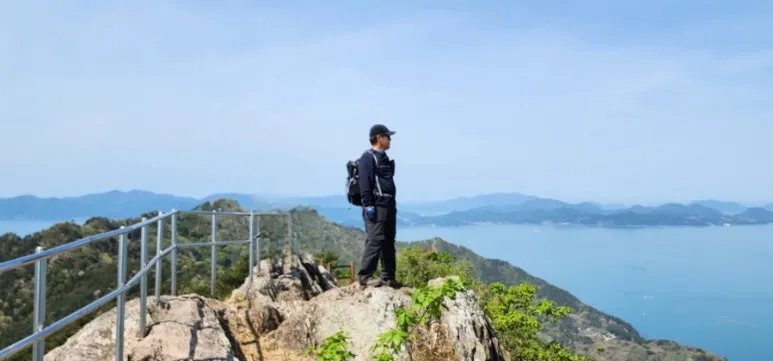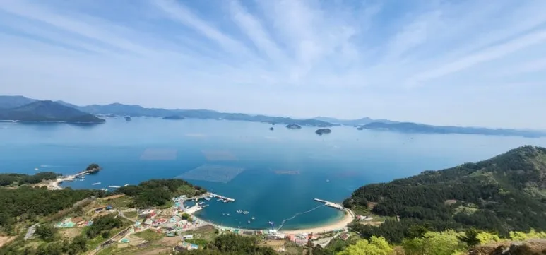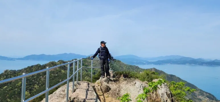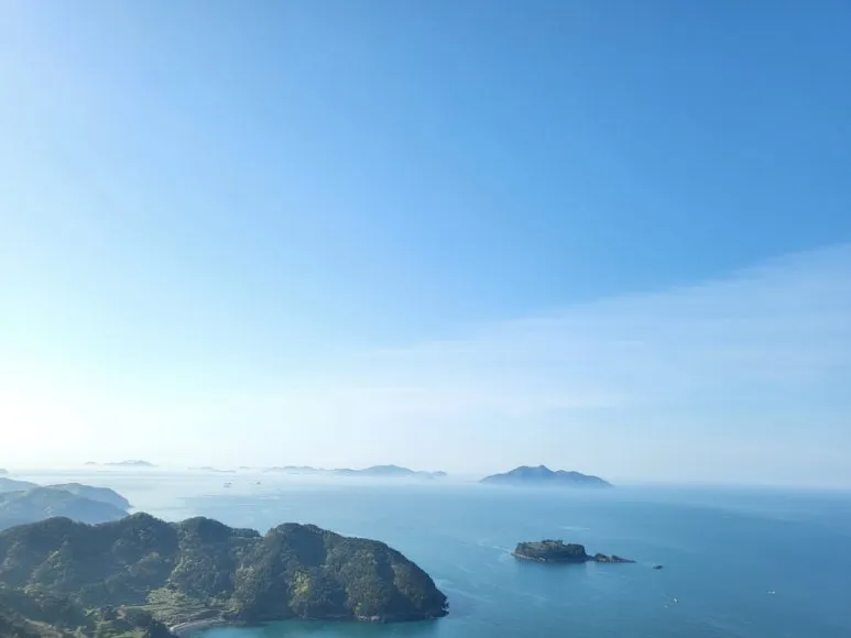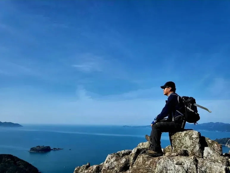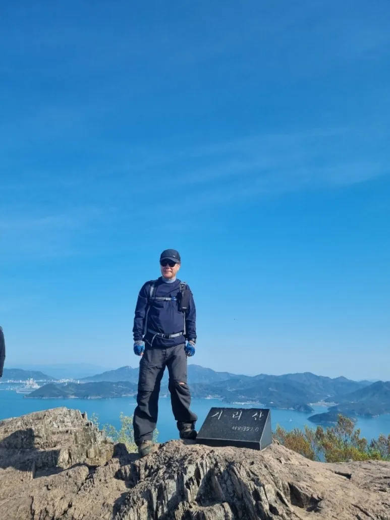 오전 7시 20분경, 사량도 돈지항에 도착해 산악회 버스를 타고 수우도 전망대로 이동했다. 이곳은 산행의 시작점으로, '소가 누워있는 섬'의 형상을 하고 있다. 산행을 시작하자마자, 사량도의 가파른 경사와 독특한 암벽이 우리를 맞이했다. 牛空은 이 암벽을 생선의 비늘에 비유했다. 각진 암벽을 조심스럽게 잡고 밟으며 사족보행을 하다 보니, 곧 지리산(과거에는 지리망산이라 불렸다) 정상에 도달했다. 산행 중에는 왼쪽으로 초록빛 바다 너머 육지의 지리산이, 오른쪽으로는 푸른 통영의 바다가 동행해 주었다. 통영의 하늘과 바다, 그리고 육지의 지리산이 각자의 푸르름과 초록색을 경쟁하듯 뽐냈다. 아름다운 경관에 발길이 멈추어 잠시 쉬었을 때, 통영 앞바다의 매력에 깊이 빠져들었다.