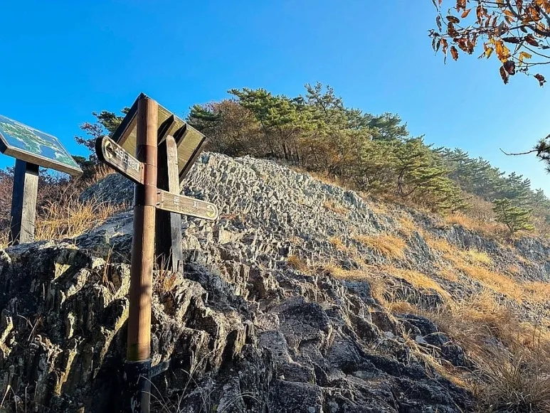 얇고 각진 널빤지를 붙여 놓은 듯한 암벽과 암릉