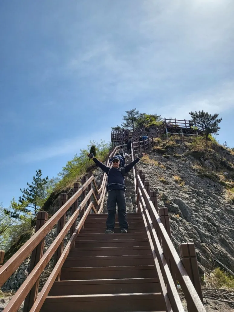 칼날 같은 바위의 안전시설을 의지해 걸으며 어느덧 달바위, 가마봉, 출렁다리를 지나 옥녀봉에 도달했다. 생존 본능을 자극하는 사다리 같은 급경사(80°) 계단 난간을 잡고 두 개를 넘어서야 비로소 여유롭게 걸을 수 있는 길을 만났다. 하산길에서 뒤늦게 사량도 산행을 시작하는 등산객들과 인사를 나누며 오늘의 하산 집결지인 사량면 사무소 앞에 도착했다. 사량면 사무소 근처에 도착해 땀에 젖은 옷을 갈아입었다. 근처 편의점에서 차가운 콜라 한 병을 원샷으로 들이키자 온몸에 탄산의 시원함이 퍼져나갔다. 이런 상쾌함이 바로 힘든 등산을 견디게 하는 이유인 것 같다! 구름 한 점 없이 뜨거운 태양 아래에서 의섭이와 함께한 아찔하고도 황홀했던 사량도 여행을 이제 마무리 지어야 할 시간이다.