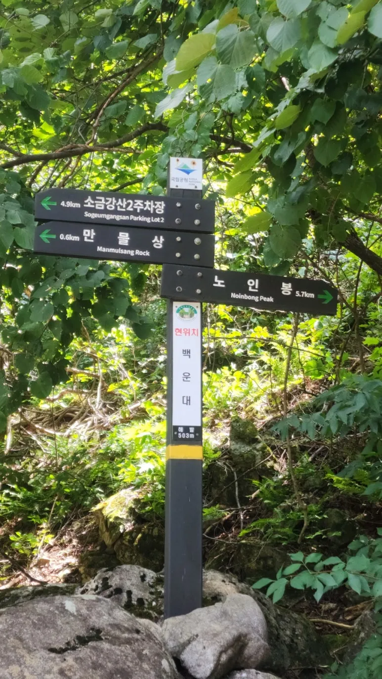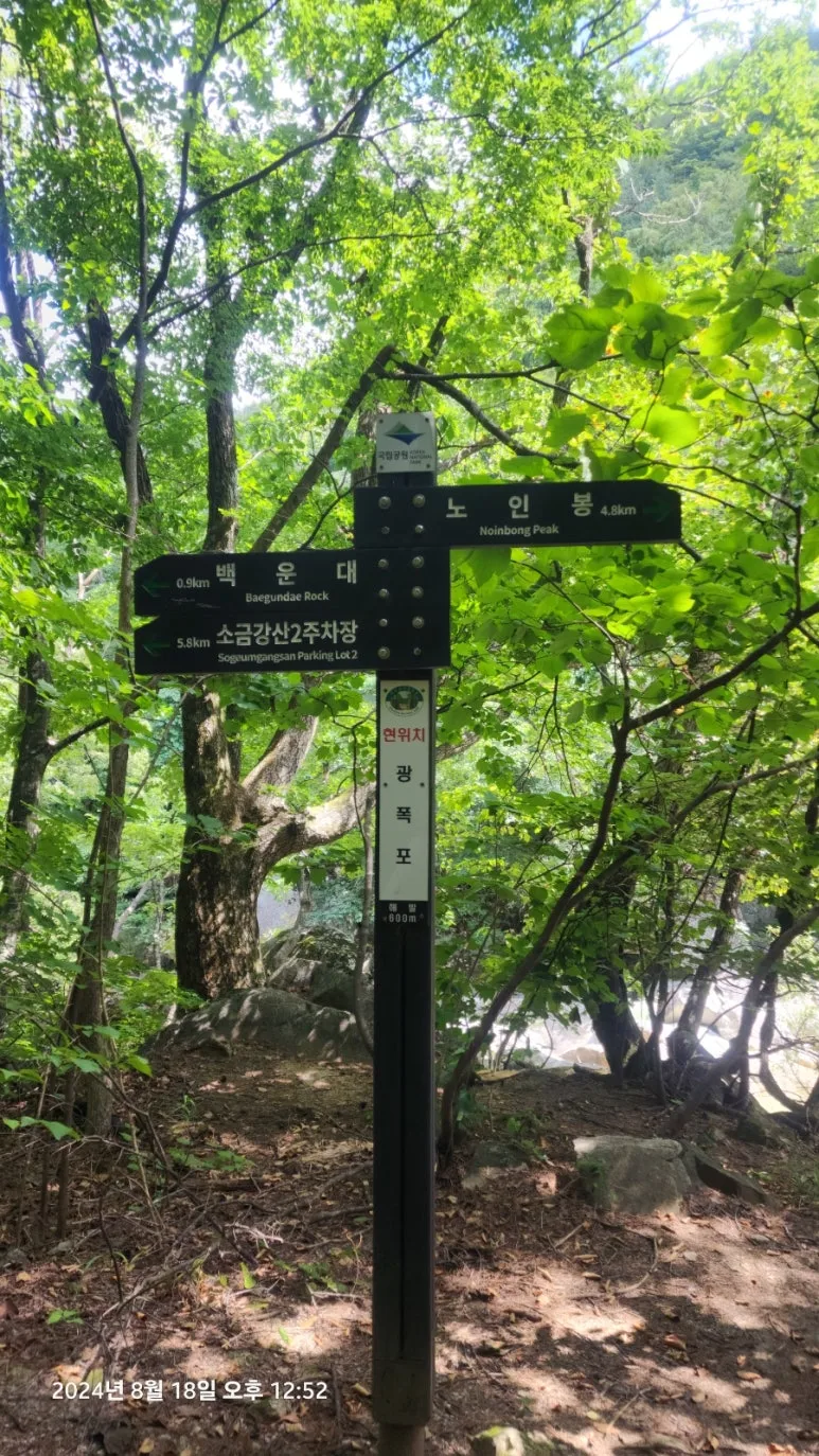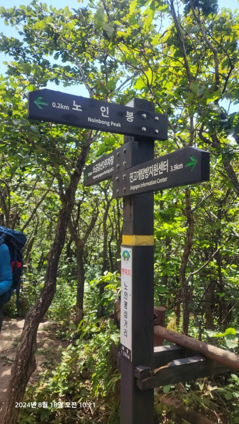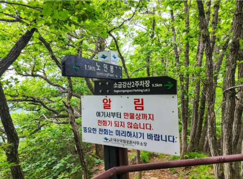 노인봉 정상석 뒷면은 한글로 쓰여있다. 노인봉 정상에서 다시 노인봉 삼거리로 내려와 소금강산 제2주차장 방향으로 하산하면서 소금강 계곡의 멋진 풍광을 만날 수 있었다. 노인봉 삼거리에서 소금강산 제2주차장 방향으로 조금 내려와 취사와 야영이 금지되고 화장실도 없는 노인봉 무인 관리 대피소를 지났다. 여기서부터 백운대까지의 구간은 암반이 많고 미끄러워 오대산 산악 사고 중 거의 대부분이 이 구간에서 발생한다고 한다.