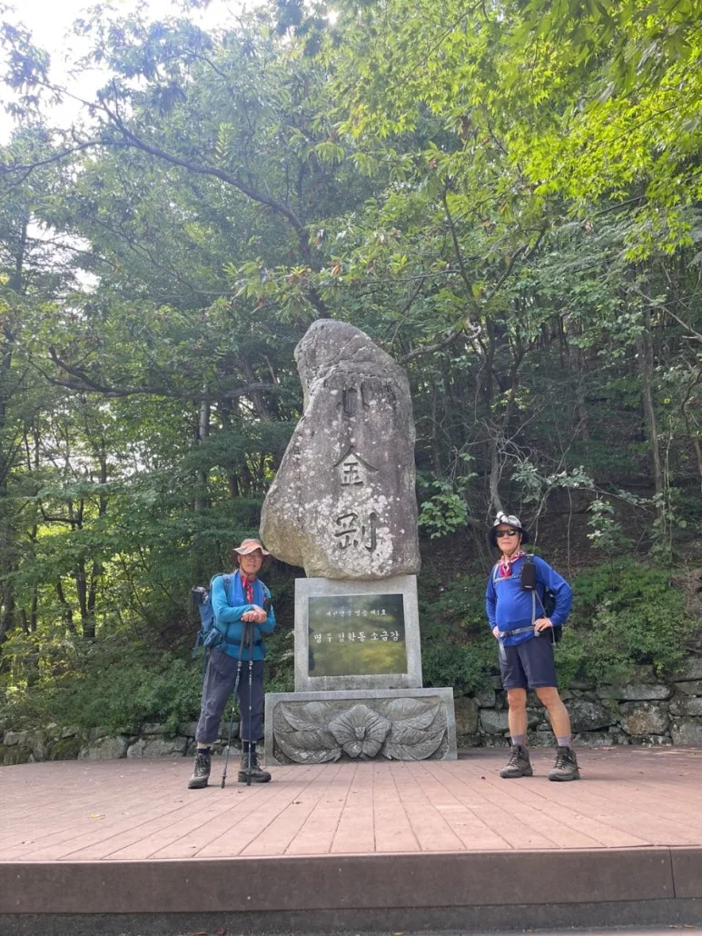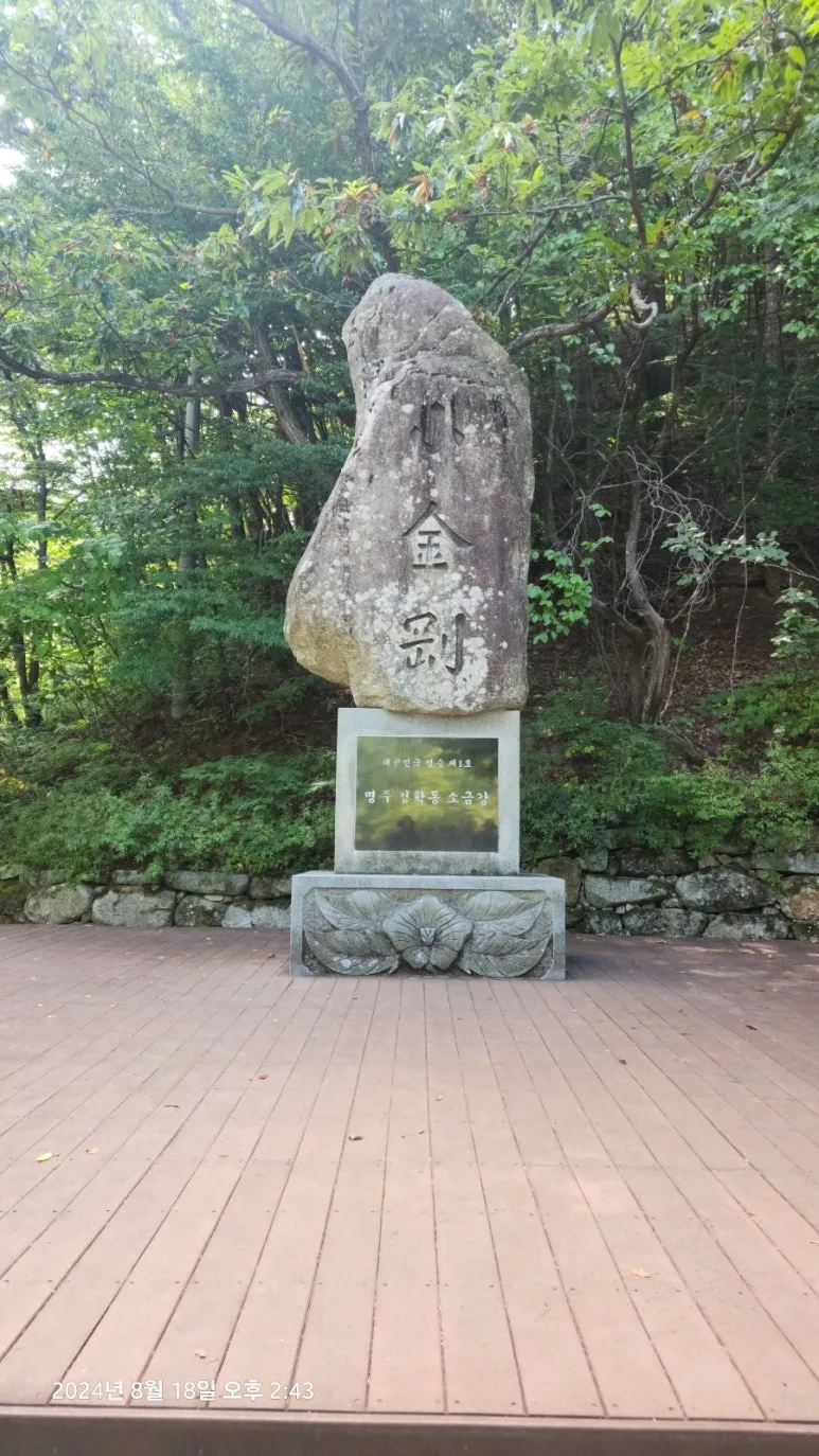 구룡 폭포를 배경으로 구룡폭포에서 금강사를 지나면서 잠시 약수로 갈증을 달래고 하산 집결지를 향해서 다시 힘차게 걸어서 소금강산 입구에 도착했다. 커다란 표지석에는 '대한민국 명승 제1호 명주 청학동 소금강'이라고 쓰여 있었다.