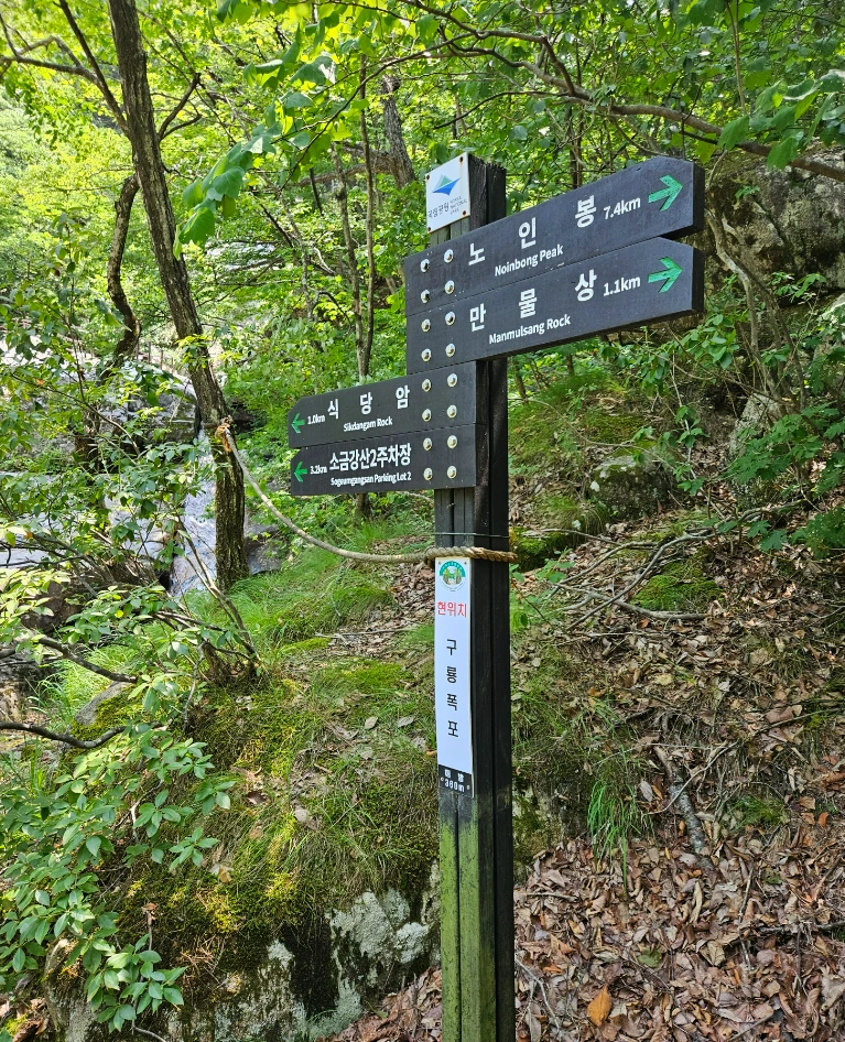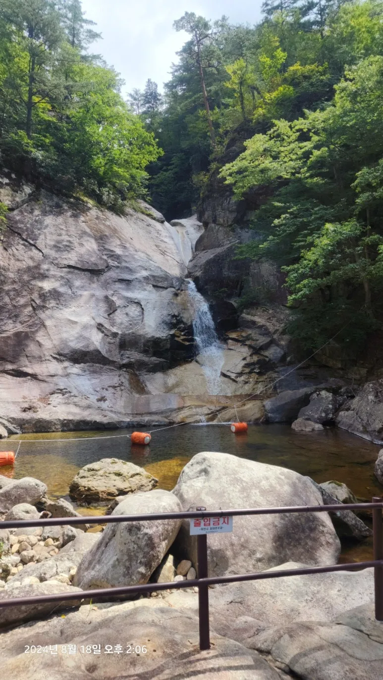 만물상 구룡폭포는 소금강을 대표하는 폭포로 구룡소에서 나온 9마리의 용이 폭포 하나씩 차지했다는 전설이 전해지는 명소이다. 1 폭포에서 7 폭포는 위쪽에 있어서 보이지 않고 지금은 통제 구간이라 하며 8, 9폭 포만 볼 수 있었다.