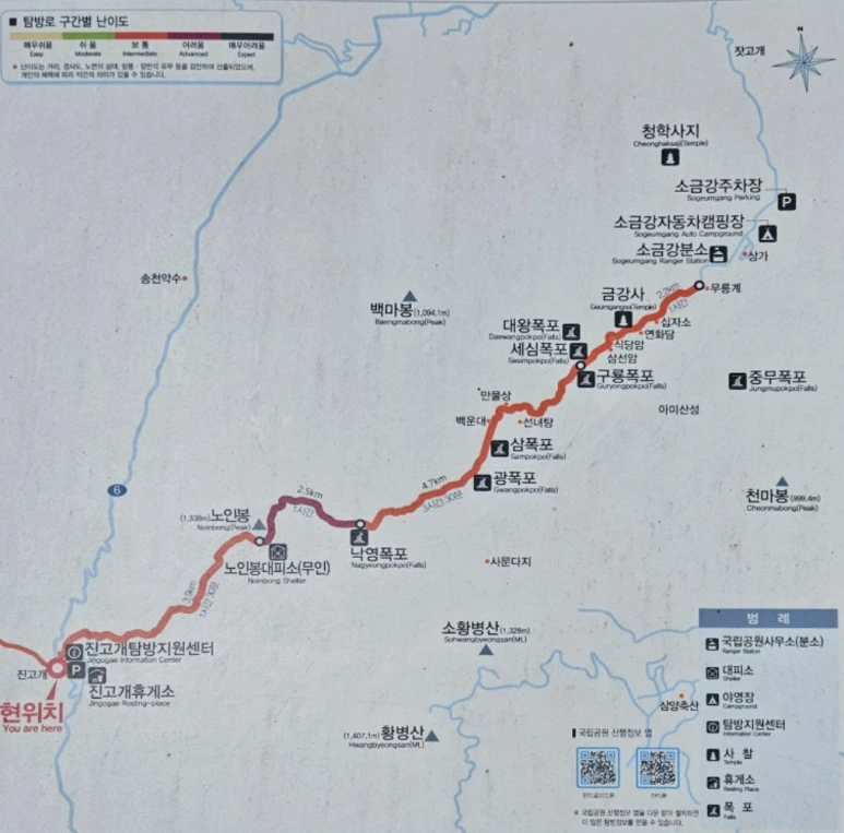 산행 코스:진고개 정상 휴게소 출발~노인봉~노인봉 무인 대피소~낙영폭포~광폭포~삼폭포~백운대~선녀탕~만물상~구룡폭포~학유대~식당암~십자소~금강사~무릉계폭포~소금강산주차장 도착