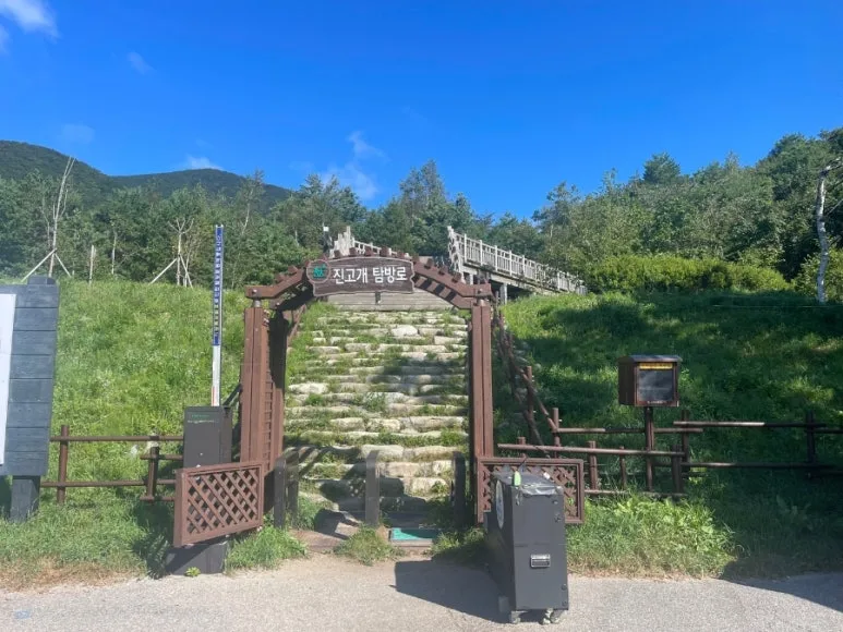 들머리 진고개 탐방로 입구 오전 9시에 노인봉을 향한 등반을 본격적으로 시작하였다. 흰 구름이 수놓은 파란 하늘과 초록빛의 산야가 멋지게 조화를 이루고 있었다. 진고개에서 노인봉까지는 계속 계단으로 이루어진 가파른 오르막길이었다. 하지만 울창한 숲길로 여름날의 뜨거운 햇볕을 피할 수 있어 크게 힘들지는 않았다. 중간중간 들려오는 이름 모를 새들의 지저귐과 길가 곳곳에 피어 있는 아름다운 야생화들이 발걸음을 가볍게 해 주었다.