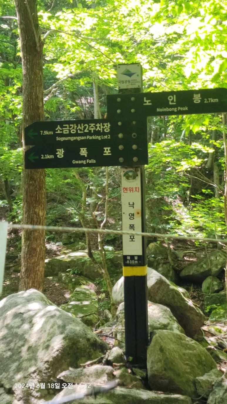 낙영 폭포 낙영폭포에서부터 계곡의 폭도 넓어지고 수량도 많아지면서 계곡의 시원한 바람과 물소리가 하산길의 발걸음을 가볍게 해 주었다. 낙영폭포에서 광폭포에까지는 비교적 완만한 길로 많은 목재계단이 설치되어 있었다. 계곡 중간중간에는 이름 없는 멋진 계곡과 폭포들과 깊은 골짜기가 자리하고 있었다.