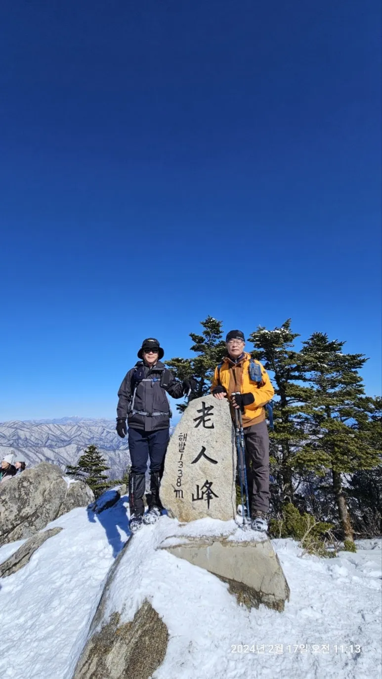 2024년 2월 17일 노인봉 정상 연일 살인적인 폭염과 기록적인 열대야로 폭염 경보가 계속되는 오늘(8월 18일) 반년만에 노인봉을 다시 찾았다. 가까운 지인들과 함께 진고개 탐방로에서 노인봉1)을 거쳐 소금강2) 계곡에서 등산의 피로를 풀고 땀을 식히는 알탕을 즐기고 하산하는 산행을 하였다.