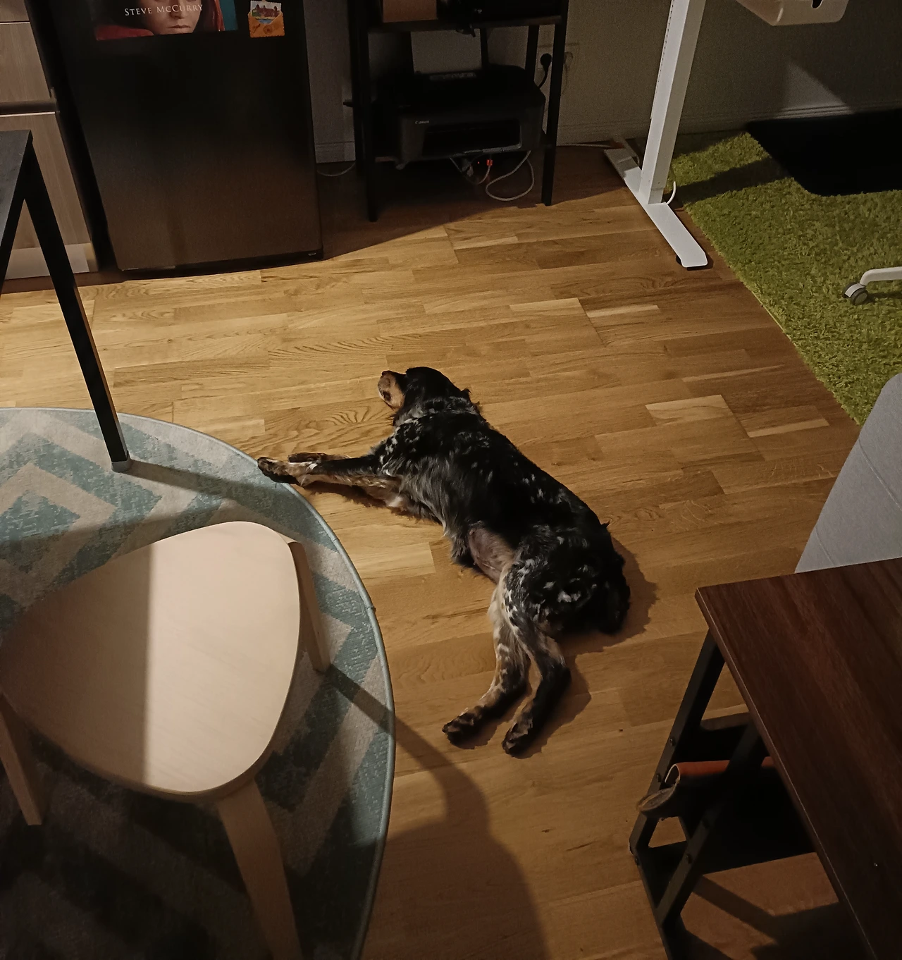 개는 맨 바닥을 선호한다. 카페트나 담요를 마다하고 개는 맨바닥에 털썩 눞는다. 개는 천천히 눞지 않고 한번에 털썩 자신의 몸을 바닥에 떨어뜨린다. 아플거 같다. 하지만 개는 개의치않고 털썩 눞기를 반복한다. 개의 눞는 소리는 집안에 울린다.