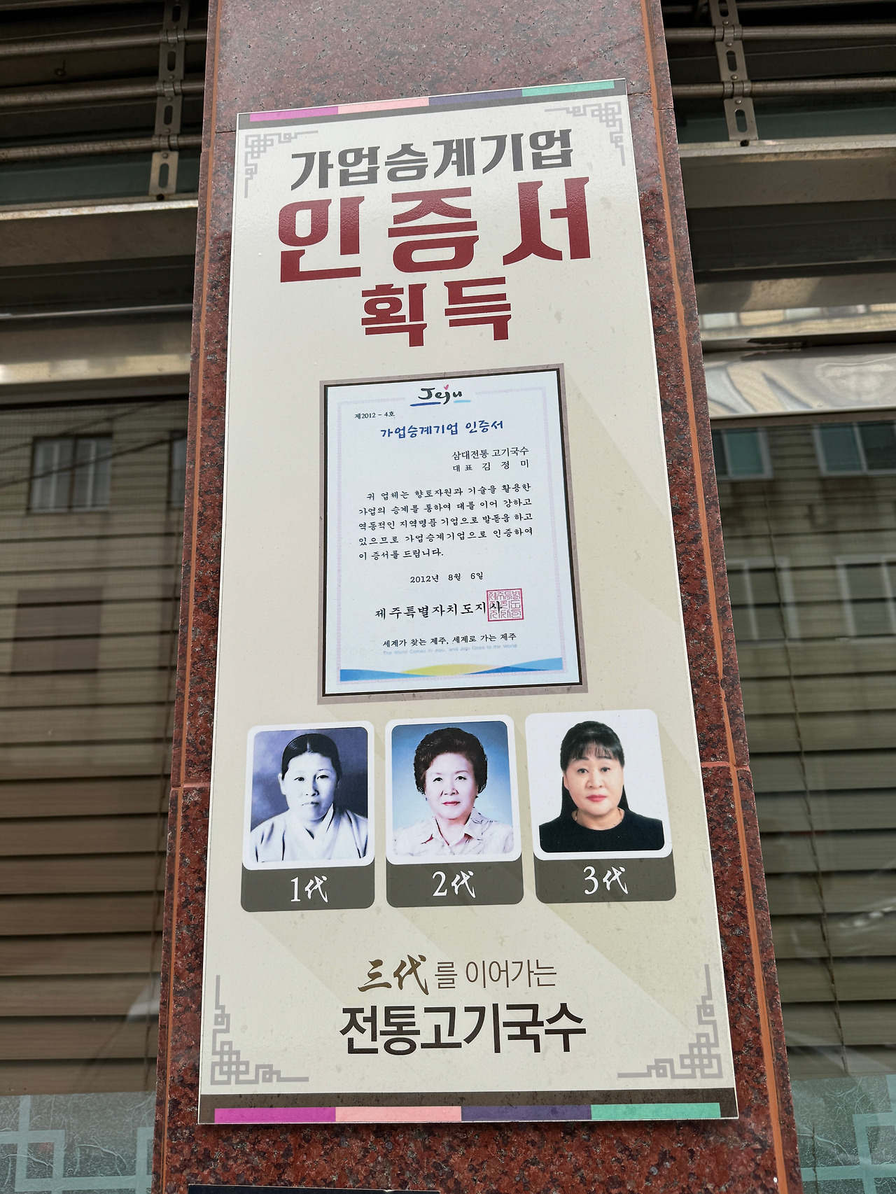 상호명 그대로 삼대를 이어 온 오래된 국숫집이다. 삼대전통고기국수는 한국전쟁 시기에 개업한 곳이다. 인천 인근으로 시집간 할머니께서 전쟁이 발발하자 고향인 애월로 피난온 후, 한두해 지나 영업을 시작하셨다고 한다. 그래서 이곳의 정확한 개업일은 초대 사장님께서도 정확히 기억하지 못한다. 제주도청에서 조사한 기록은 1950년 개업. 아마도 피난 와서 장사를 시작했다고 하니 전쟁 발발시점으로 기록한 듯하다. 전문가들은 52년 경에 개업했다는 의견을 낸다. 오로지 전쟁통이었기에 이런 일이 생길 수 있었다. 게다가 이 집은 한동안 존폐의 위기에 처하기도 하였다. 정확한 이유는 밝혀지지 않았지만 2대째 사장님인 어머님께서 10여 년 이상 문을 닫았던 적도 있다. 1996년 경 2대째 사장님의 따님들이 다시 간판을 달고 영업을 시작하여 오늘날에 이르고 있다. 영업한 기간만 보수적으로 잡아도 50여 년이 훌쩍 넘는다.