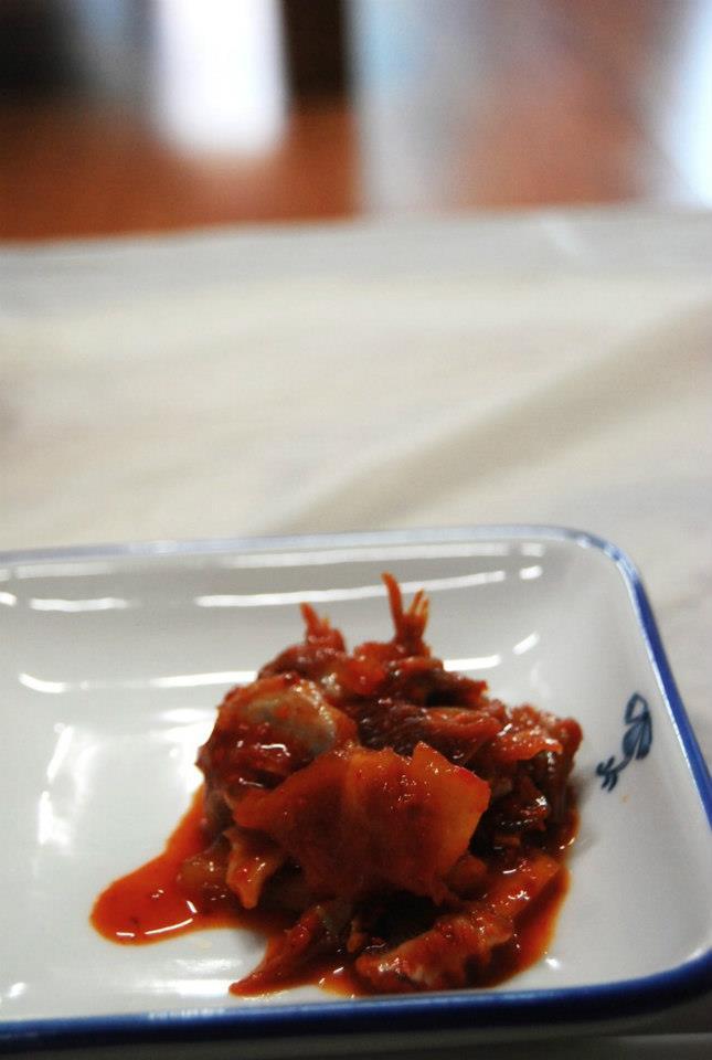 넓은 상에 기본찬과 대구의 부속물(아가미, 알 등)로 만든 젓갈들이 올라온다. 이윽고 말린 대구로 잘라낸 대구회가 한 접시 오른다. 생대구의 물기 많은 흐물흐물한 살결이 아닌 정말 약간의 수분만 남은 꾸덕꾸덕한 살이 확연히 눈길을 끈다. 게다가 사장님께서 신경 써주셔서 잘 마른 껍질까지 함께 잘라주시니 이런 호사가 또 없다.