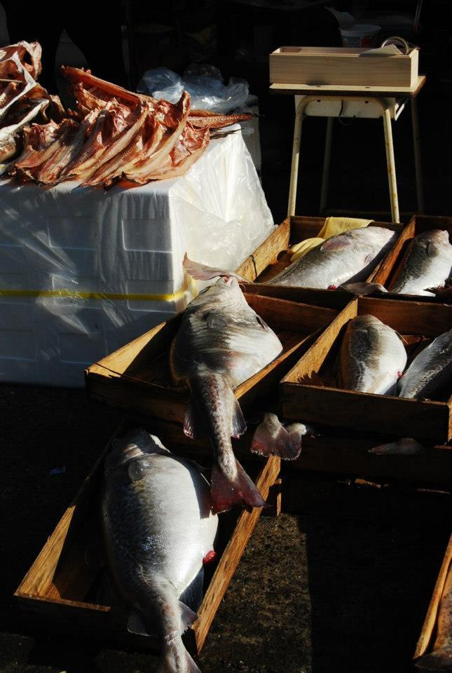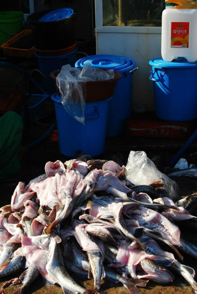 경매장이 자리 잡은 외포항 안쪽까지 들어오면 꽤 많은 횟집들과 생대구나 말린 건조 대구를 파는 천막들이 지천이다. 서울의 수산시장이나 쇼핑센터 수산코너에서 우리가 흔히 접할 수 있는 대구는 이곳에 와 보면 어린 대구정도로 치부할 수 있다는 것을 깨닫는 데에는 그리 오랜 시간이 걸리지 않는다. 고개만 돌리면 눈에 치이는 것들이 8~90센티가 넘는 것들이고 1미터를 넘는 녀석들도 흔하디 흔해 이건 숱체 대구가 아니라 괴물이 아닐까 하는 생각마저 들 정도.