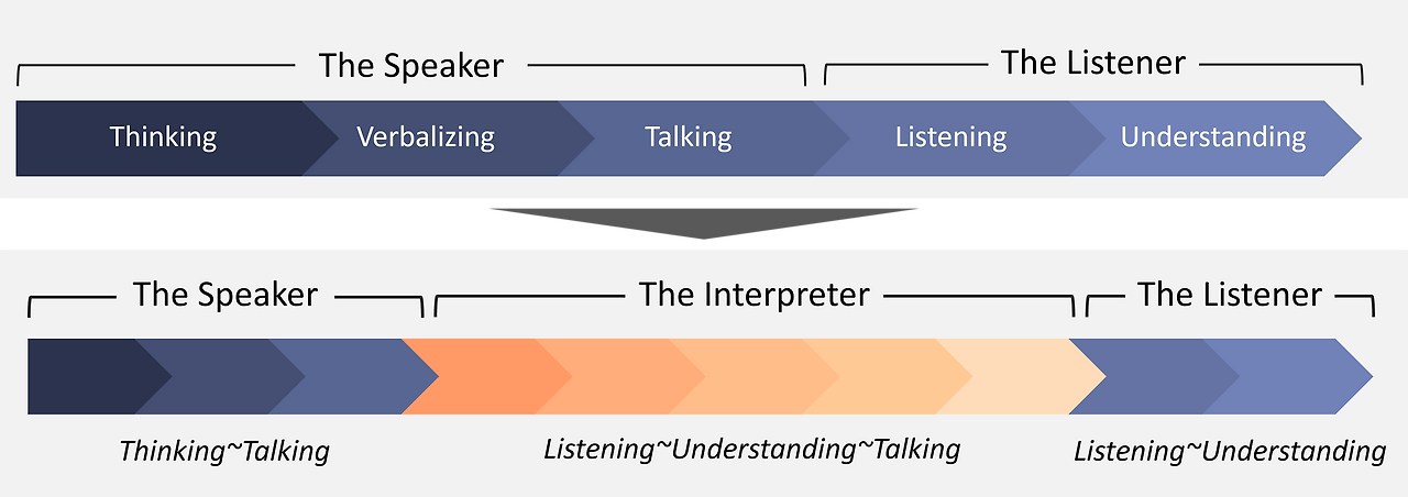 Input을 고르는 고민은 보다 세부적으로 다음 포스팅에서 다루겠지만, 큰 틀에서 가치사슬에 대한 첨언을 한 가지 더 하고자 합니다. 통역사의 위치에 대한 얘긴데, 메시지 가치사슬 상 Talking과 Listening 단계 사이에 있습니다. 그래서 많은 사람들이 통역사는 Talking 단계의 Input, 즉 발화자의 발언만을 가지고 그대로 청취자에게 전달한다는 오해하기도 합니다. 왜 사전에 통역사에게 자료를 공유해야 하는지 되물은 클라이언트도 많았습니다. 그냥 현장에서 듣고 하는 건데 왜 자료를 넘겨줘야 하느냐는 것이었는데요, 같은 오해로 인한 반응인 것입니다.