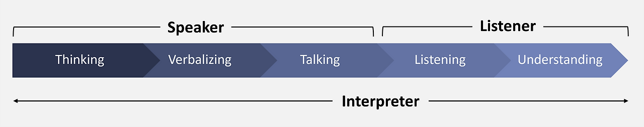 저는 개인적으로 (야매적으로) 이런 고민을 어떻게 안정적으로, 명확히 할 수 있을지 저만의 프레임워크를 구했습니다. 소통은 결국에 말하는 사람의 생각이 듣는 사람의 생각으로 되기까지 표현과 전달의 과정인데, 이걸 일명 '소통의 밸류체인'으로 정리한 겁니다. 그럼 적어도 두 사람 사이에서 통역할 때 서로 이해할 수 있도록 돕는 입장으로서 알아야 할 모든 것이 여기 담겨있다고 볼 수 있겠죠.