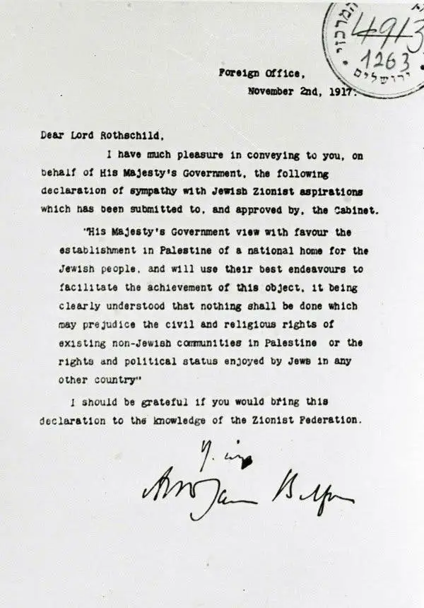 종이는 인간이 만든 가장 놀라운 발명품 중 하나이다. 종이는 우리의 다양한 생각을 정리하고 세상에서 벌어지는 많은 일들을 기록할 수 있게 해준다. 종이를 통해 과거의 많은 업적과 작품들이 후세에 전승 될 수 있었고 인류는 더욱 발전 할 수 있었다. 때로 종이는 상기한 역할 이상의 엄청난 의미를 가질 수도 있는데 1917년 11월 2일에 작성된 종이 한 장이 바로 그러한 것에 속했다. 그 한 장의 종이는 지극히 건조한 문체로 쓰여진 한 장의 공식 레터였는데 그 내용이 함축하는 폭발적인 의미를 담기에는 너무나도 단순해 보였다. 레터의 발신인은 당시 대영제국 외무장관이었던 ‘아서 밸푸어 경’이었고 수신인은 전직 의원이자 영국 內 유대인 단체의 수장인 ‘월터 로스차일드’였다. 도대체 그 레터 한 장에는 어떤 내용이 담겼던 것일까?