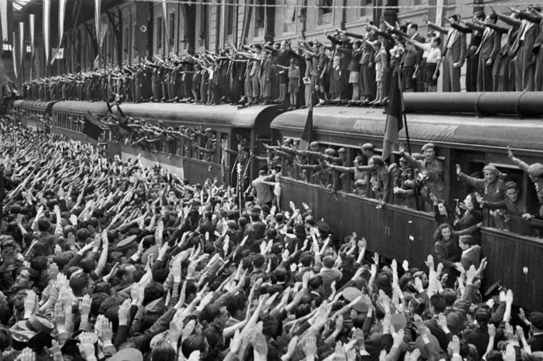 엄청난 환송을 받으며 마드리드 역을 떠나는 블루 디비전 병사들