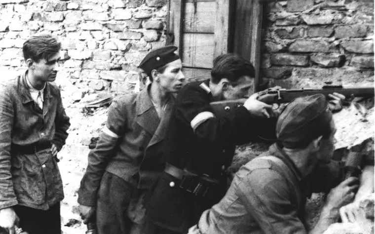 비르샤바 봉기 당시 팔에 폴란드 국기를 두르고 전투 중인 국내군