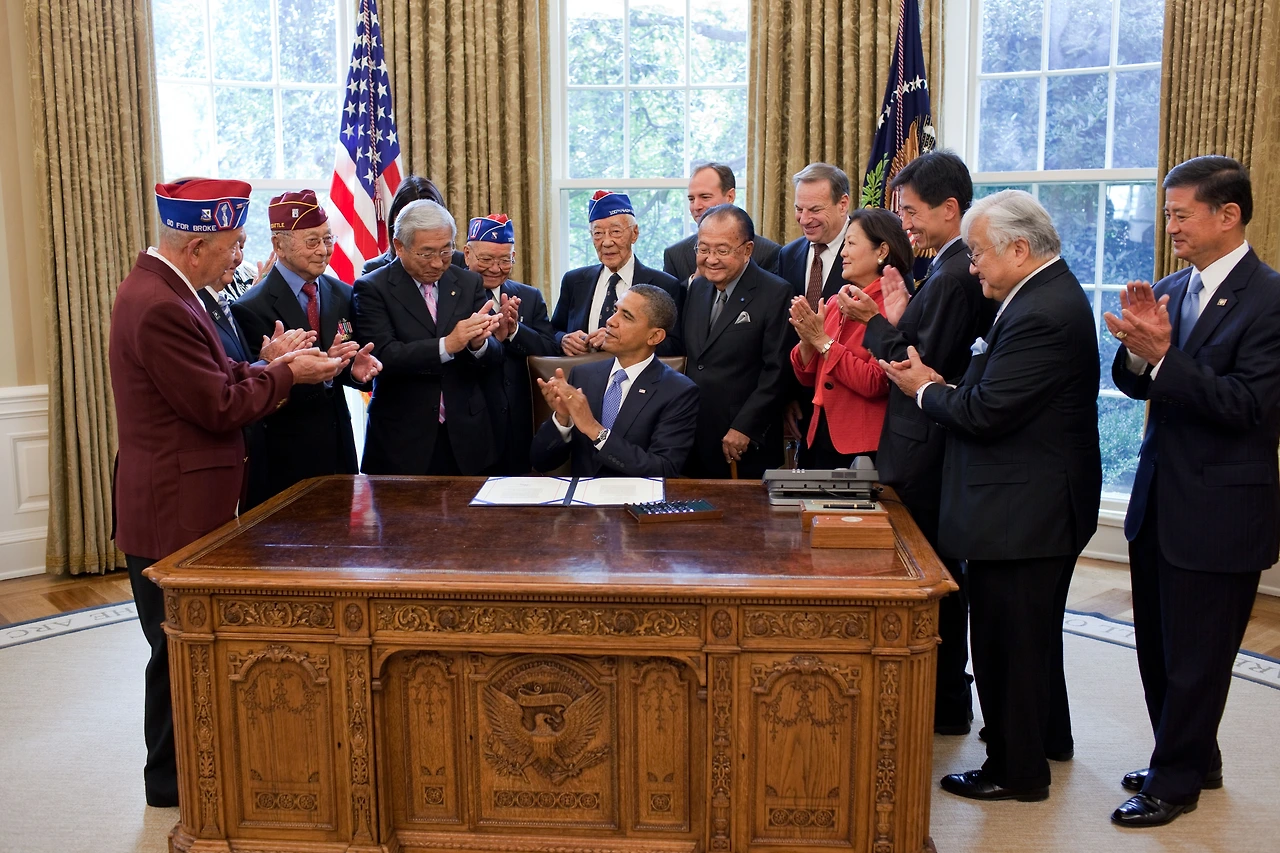 의회 황금장 수여에 서명한 오바마 대통령과 함께한 442연대 참전용사들