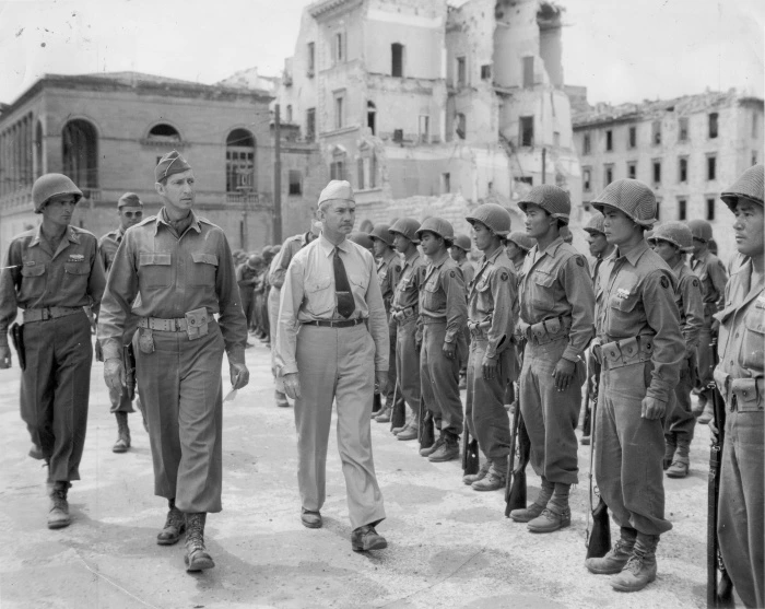 5군사령관 마크 클라크 장군(좌측 두번째)과 해군성 장관 제임스 포레스탈(좌측 세번째)에게 사열 받고 있는 100대대 병사들