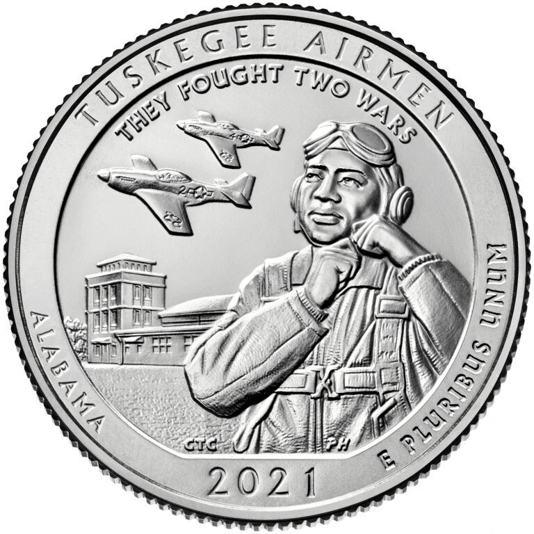 2021년에 나온 신규 25센트 동전. 무명의 흑인 조종사가 새겨져 있다.