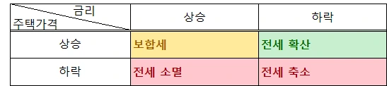 주택가격이 상승하고 금리가 높아지는 상황에서는 주택가격의 상승에 대한 기대와 금리로 인한 대출의 부담의 경중에 따라서 전세의 추세가 결정될 것이다. 집주인은 금융기관에서 빌리는 것보다 저렴한 가격에 목돈을 융통할 수 있어 전세를 공급할 의사는 있겠지만, 세입자 측면에서 금리가 높기에 목돈을 대출받아 전세보증금을 마련하기 어려울 것이다. 일반적으로 보았을 때 주택가격의 상승 압력이 있더라도 매월 지불해야 하는 대출금리가 높아지면 목돈을 빌리기 어렵고, 이러한 수요감소에 따라 전세는 축소 추세를 보일 것으로 예측된다.