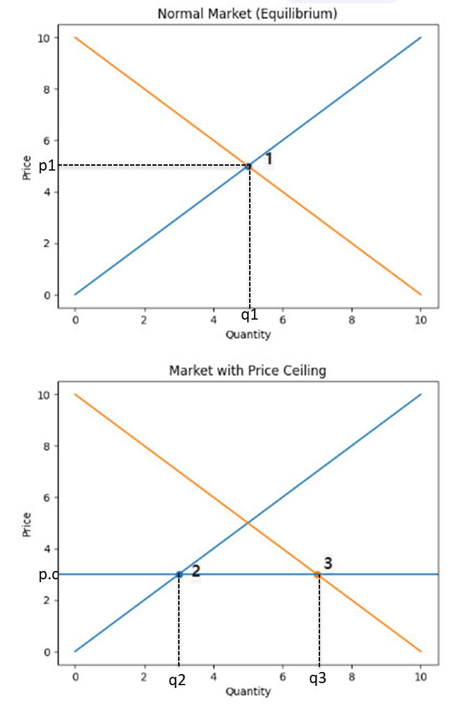 시장에서는 일반적으로 수요와 공급이 만나 균형점에서 가격이 형성되지만(1번), 분양가 상한제에서는 정부가 가격상한제(price ceiling)를 도입함으로써 분양가가 주변 시세보다 낮게 형성되는 경우(p1)가 일반적이며, 실제로 분양가가 시세의 약 80% 수준으로 형성되어 왔다. 이를 통해 서민들이 저렴한 가격에 주택을 구입하는데 도움을 주었다. 하지만 시장 가격보다 낮게 형성된 가격(p.c)에서는 추가적인 수요가 존재하므로(q3-q2), 수요가 있으나 주택을 사지 못하는 사람들이 많아지면서, 이들은 주거의 안정성을 확보하기 어렵고, 불만이 증가하게 된다.